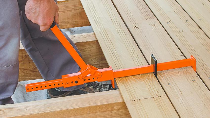 Setelah meletakkan papan pertama, anda harus mundur sekitar 50 mm dari tepi dan menggerakkan staples ke balok dengan jurang yang tidak signifikan. Jalur nipis mesti dimasukkan ke dalam celah yang muncul. Baji kayu dipasang di antara elemen ini dan pendakap, yang memastikan sambungan tepi papan yang paling ketat. Setelah memasang papan dengan skru mengetuk sendiri, pendakap dikeluarkan. Dengan cara ini, semua elemen lantai kayu dilampirkan.