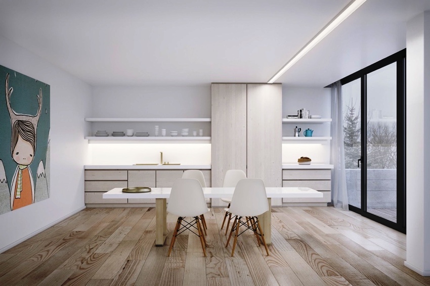 Lantai kayu di pangsapuri mempunyai daya galas yang baik. Ia dapat menahan beban yang besar. Reka bentuknya dapat menyembunyikan semua ketidaksempurnaan dan penyelewengan lapisan. Pelbagai komunikasi kejuruteraan dapat diletakkan di rongga.