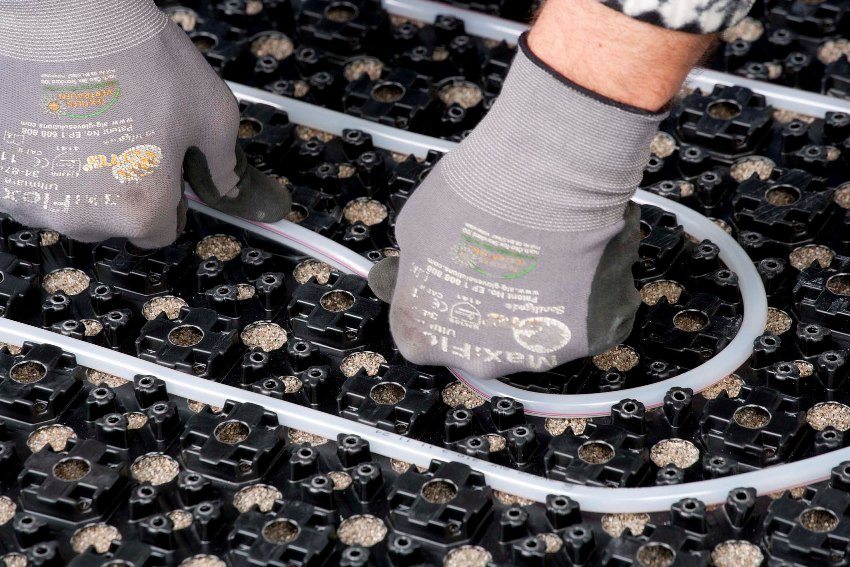 Ingat bahawa paip tidak boleh disambungkan ke dalam lapisan ini! Hitung terlebih dahulu panjang paip yang diperlukan untuk setiap litar pemanasan. Untuk kecekapan yang lebih besar, tidak disarankan membuat litar pemanasan terlalu lama - jadi, untuk paip dengan ketebalan 16 mm, putaran maksimum litar boleh menjadi 65 m, untuk paip dengan ketebalan 20 mm - 80 m.