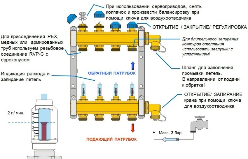 Kedua-dua hujung paip yang diletakkan dikeluarkan di tempat pengumpul lantai air suam berada. Peranti ini membolehkan anda mengedarkan aliran penyejuk melalui paip dengan kecekapan hebat. Ia mencampurkan air yang sudah disejukkan dengan air panas, yang menjadikan pemanasan seluruh permukaan lantai menjadi sama rata.