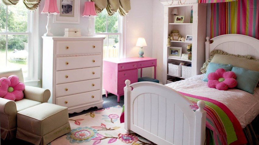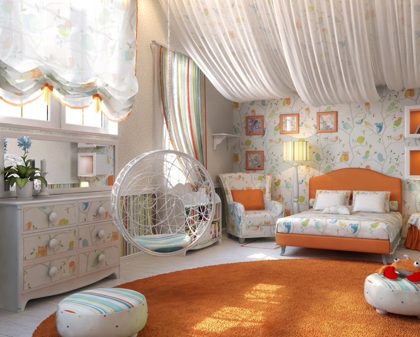 Gadis itu boleh memilih kertas dinding untuk bilik sendiri atau melekat pelekat dalaman dengan gambar watak kartun kegemarannya. Di bilik kanak-kanak, perhatian khusus mesti diberikan ke tempat tidur, yang mesti besar. Suasana yang betul di tapak semaian dicipta dengan tekstil yang betul.