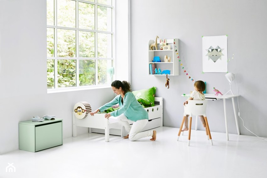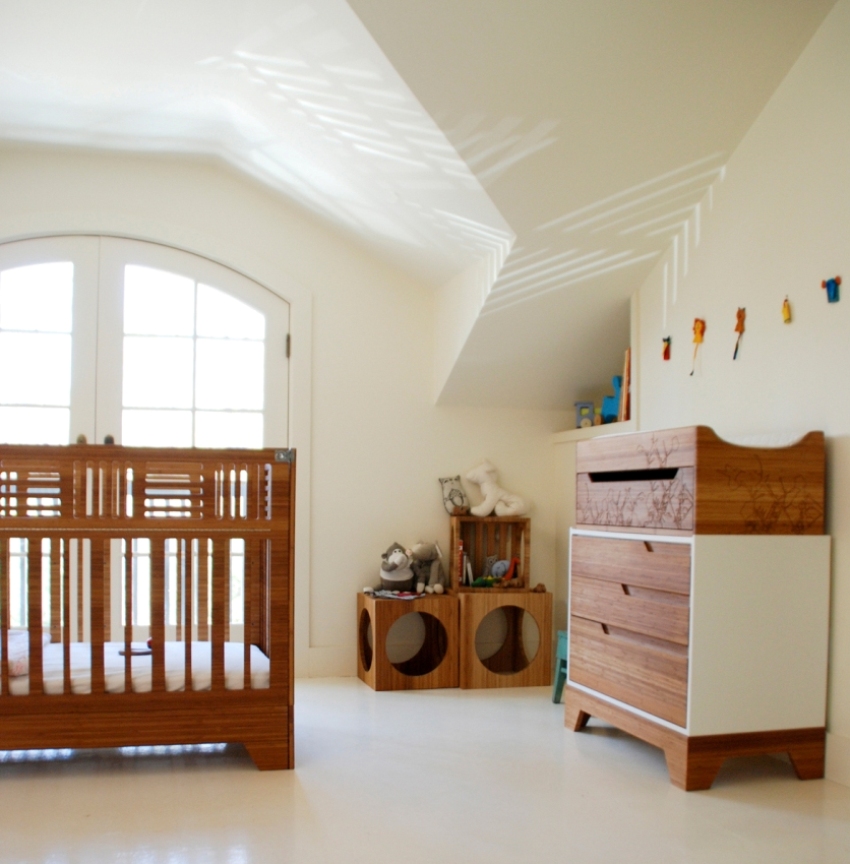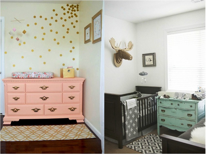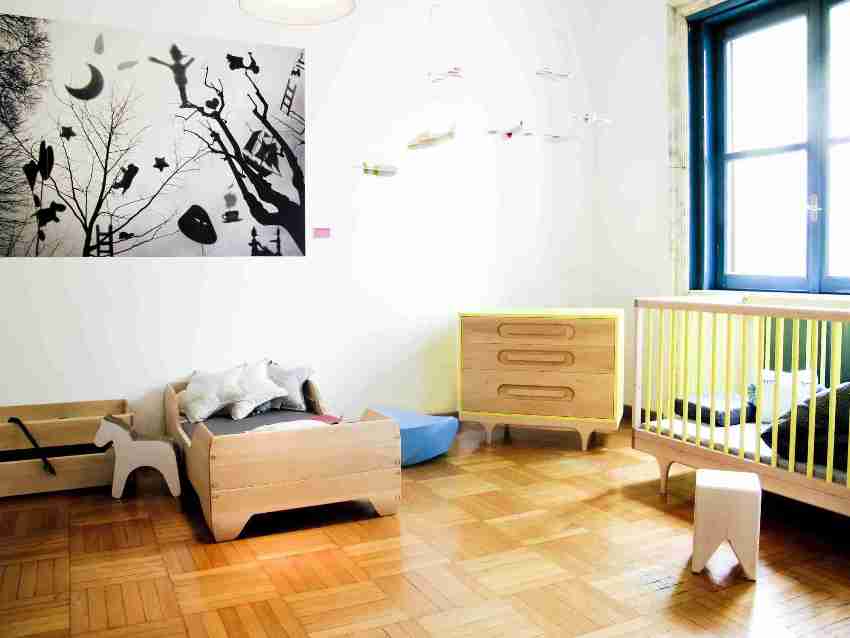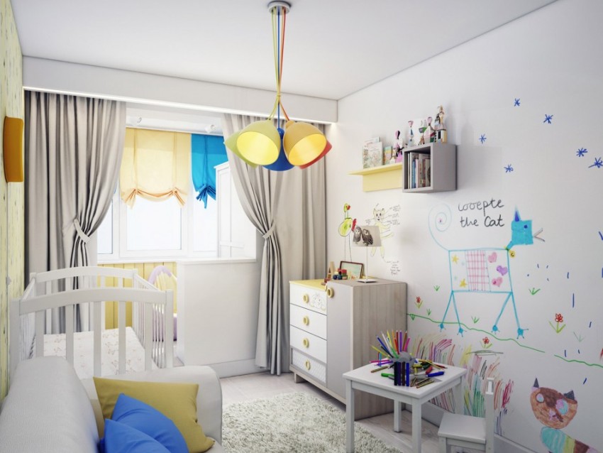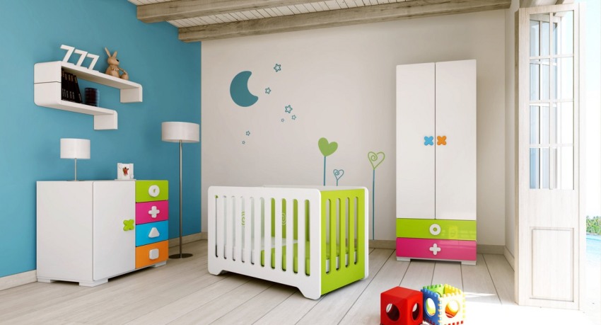 - Dengan menerapkan warna pada hiasan. Permukaannya selesai dengan warna netral yang sesuai untuk anak-anak dari kedua-dua jantina, tetapi setiap zon mempunyai perincian terang tersendiri.