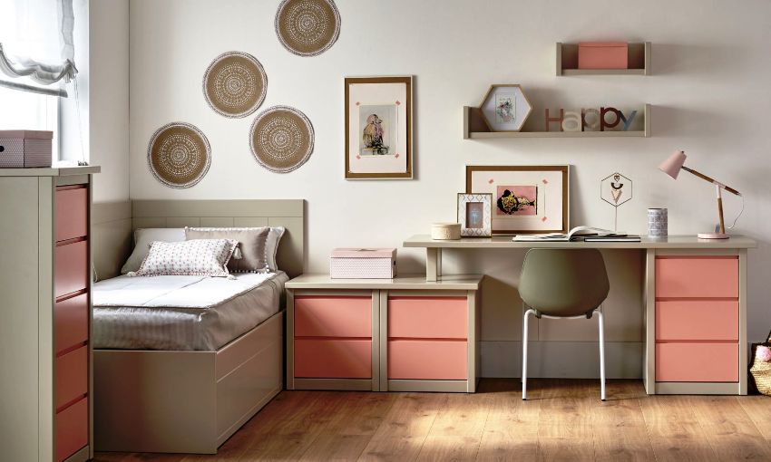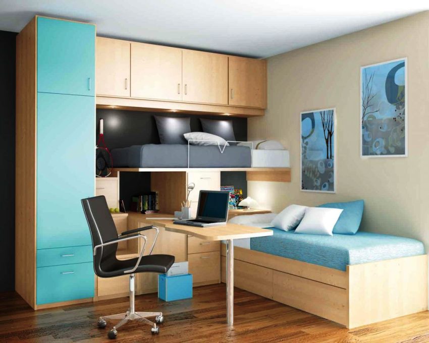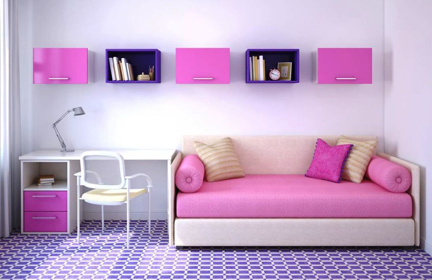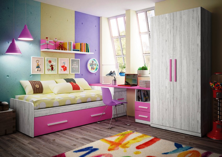 Adalah perlu bahawa gadis itu mempunyai tempatnya sendiri di mana dia dapat membawa kecantikan, dan anak itu harus memiliki meja sendiri dengan sebilangan besar laci, di mana dia dapat menyembunyikan semua yang dia perlukan. Sekiranya bilik dilengkapi untuk budak lelaki dan perempuan, maka anda boleh menggunakan pilihan berikut untuk mengehadkan ruang: