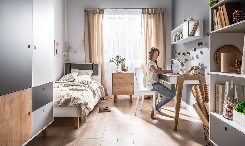 Trend moden dalam reka bentuk bilik untuk seorang gadis dikaitkan dengan susunan perabot ringan dengan latar belakang pastel