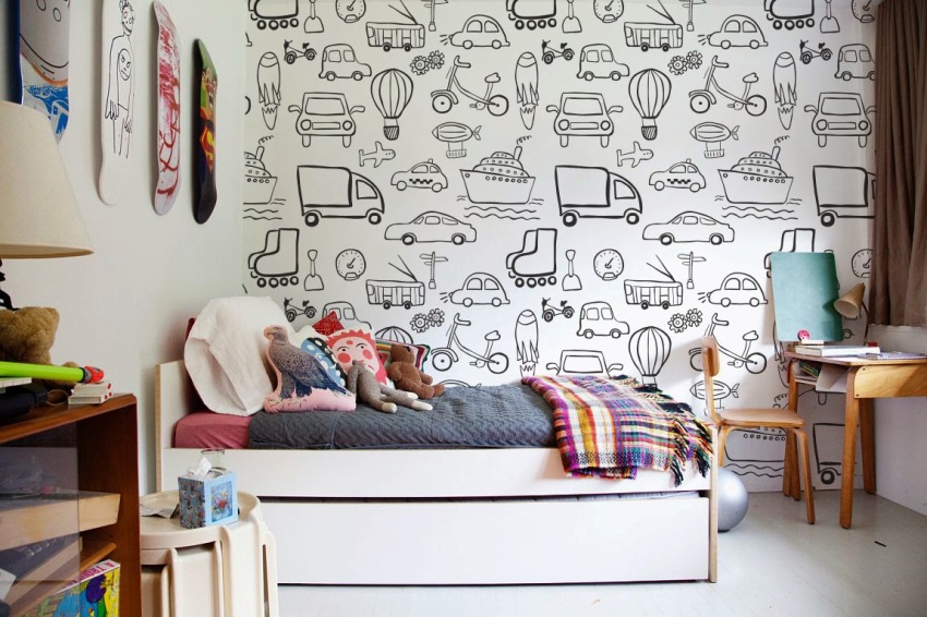 Dengan mempertimbangkan gambar reka bentuk kanak-kanak, anda dapat melihat bahawa wallpaper dengan pelbagai corak dan gambar sering digunakan. Pilihan yang paling mesra alam adalah produk kertas, tetapi ketidakstabilannya terhadap kerosakan dianggap sebagai kerugian yang ketara, yang sangat penting ketika menghias bilik kanak-kanak. Oleh kerana kertas dinding mempunyai harga yang rendah, ia boleh diganti dengan kerap jika dikehendaki.