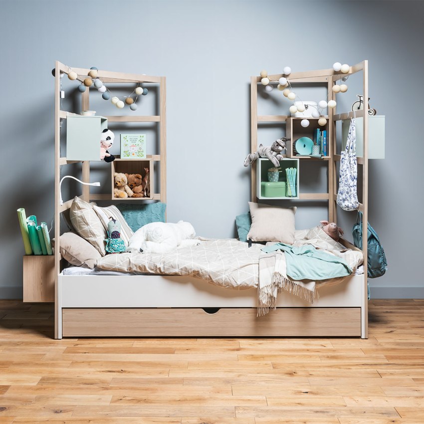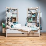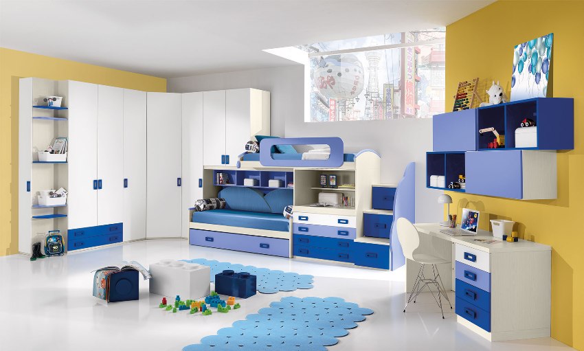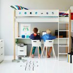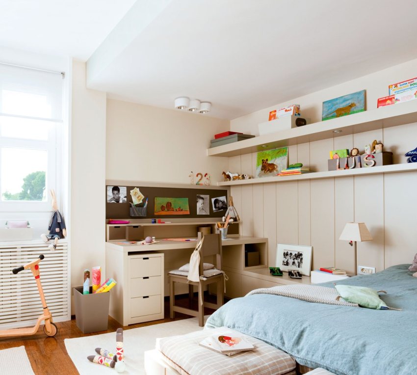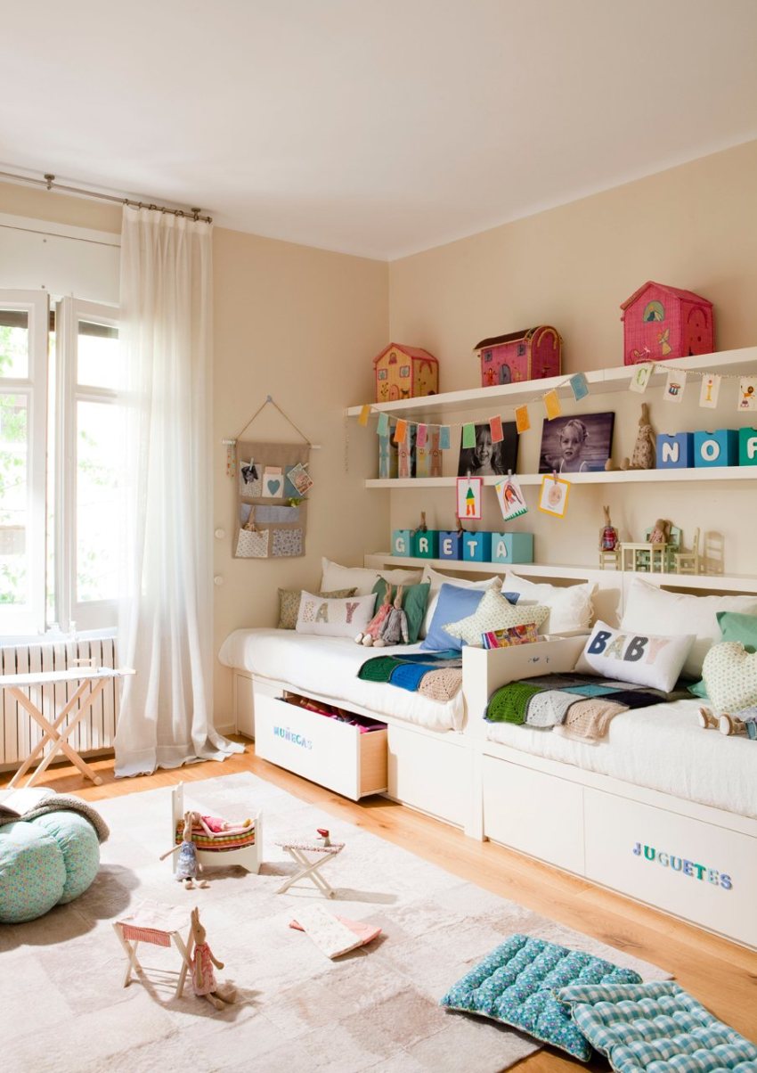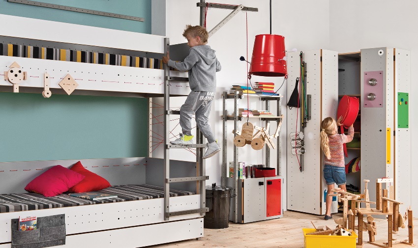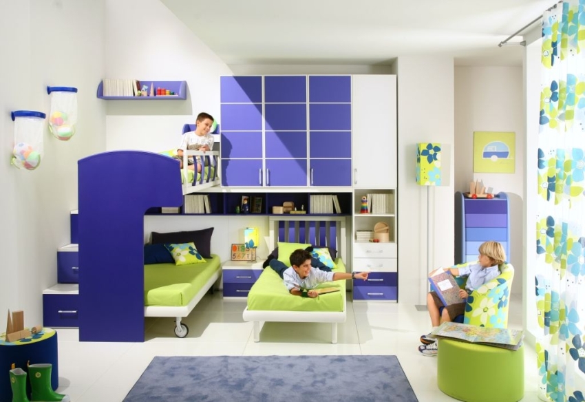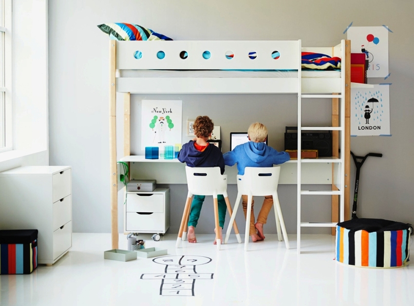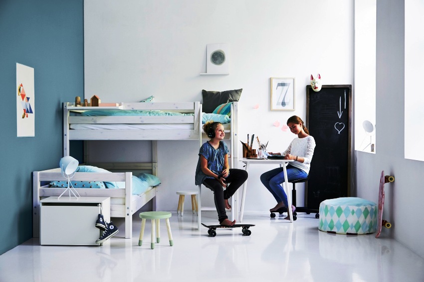 Di dalam bilik di mana dua kanak-kanak akan berehat, belajar, bermain dan menjadi kreatif sekaligus, keutamaannya adalah pembahagian ruang yang kompeten dan pengezonan yang mahir