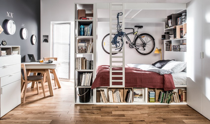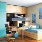 Semakin tua budak lelaki itu, semakin sedikit perabot dan aksesori yang dia perlukan. Contohnya, dalam foto bilik tidur untuk remaja lelaki, anda dapat melihat ruang yang hampir tidak mempunyai perabot, di mana hanya terdapat meja dan sofa lipat, yang memerlukan ruang minimum. Penyelesaian yang baik adalah penggunaan tempat tidur loteng, di mana kawasan kerja yang lengkap diatur. Dalam kes ini, ruang kosong digunakan bergantung pada keperluan anak. Bagi pilihan warna, anda boleh menggunakan warna terang dan gelap.