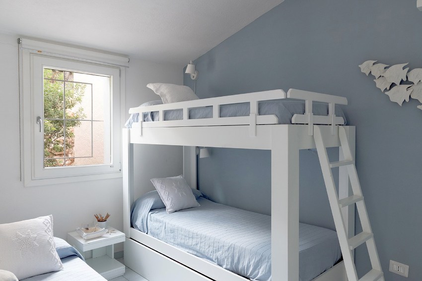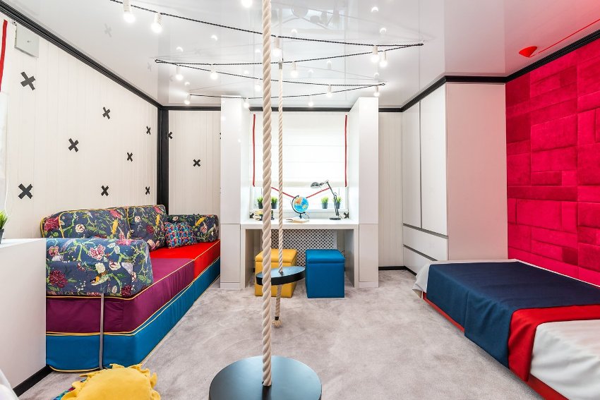 Semua kanak-kanak menyukainya apabila bintang digantung di siling yang bersinar dalam kegelapan. Untuk menanamkan minat terhadap sukan, disarankan untuk memasang bar dinding dengan cincin, tangga dan tali di bilik anak kecil.