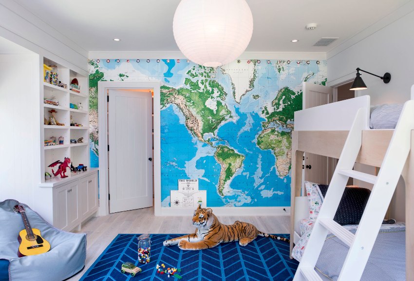 Dalam banyak foto projek reka bentuk bilik kanak-kanak, anda dapat melihat bagaimana suasana individu dan unik diciptakan dengan bantuan kertas dinding foto, tetapi penting untuk kanak-kanak itu memilih lukisannya sendiri. Semasa menggunakan kertas dinding dengan kesan 3D, kelantangan bilik kecil akan bertambah secara visual. Anda juga sering dapat menemukan dinding grafit kecil dalam foto reka bentuk bilik kanak-kanak, yang berperanan sebagai batu bolong bagi pemilik bilik.