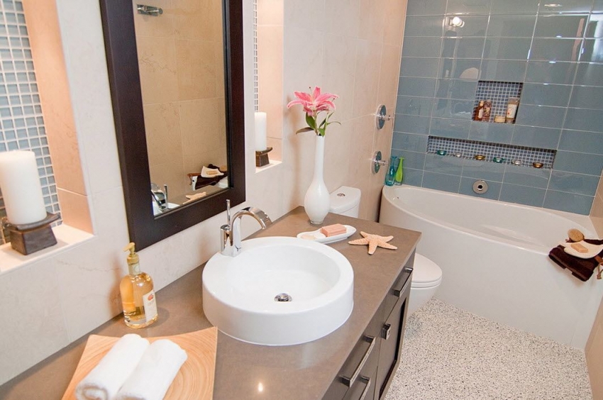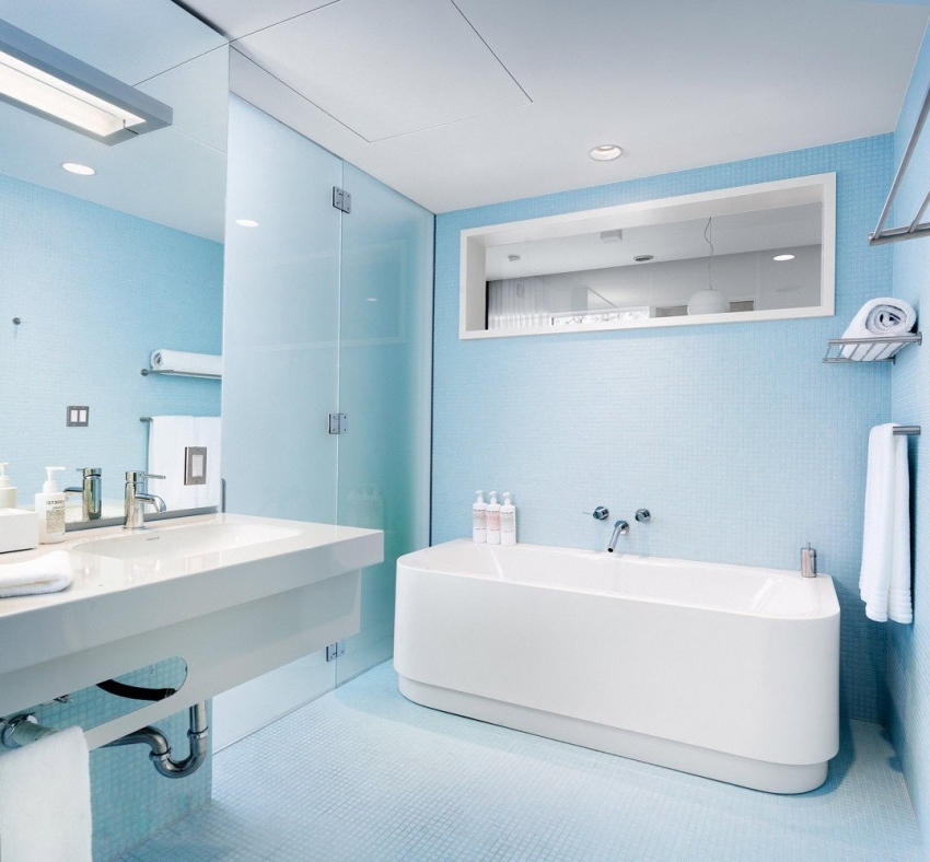 Dalam hiasan bilik mandi, foto tersebut merupakan pengesahan yang jelas mengenai hal ini, dengan luas lebih dari 2 m², kombinasi warna sesuai. Warna seperti merah jambu dan lavender, biru dan biru, krim dan coklat sesuai dengan satu sama lain.Anda juga boleh bermain dengan kontras warna biru dan kuning, putih dan merah, kuning dan ungu. Anda boleh mencairkan warna padat dengan sisipan hiasan dengan hiasan, dipadankan dengan harmoni dengan palet utama.