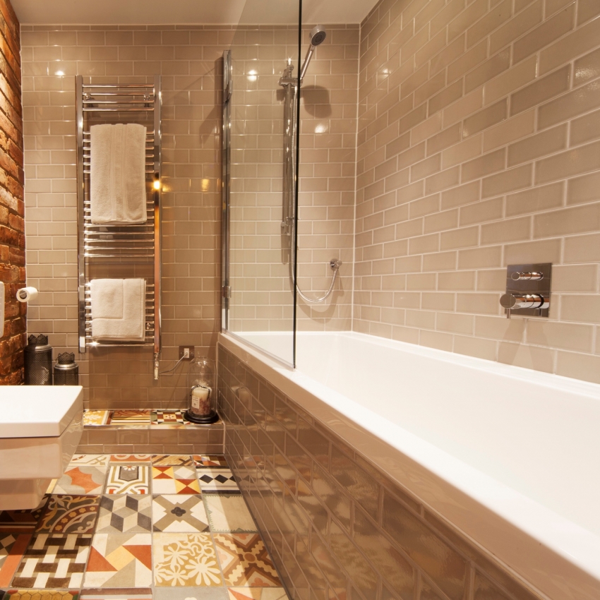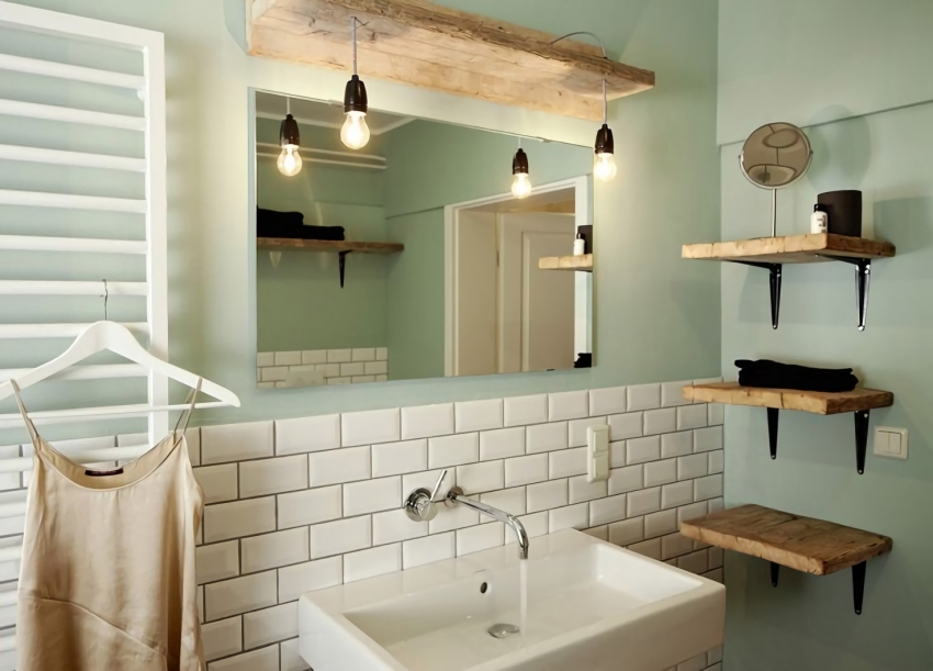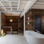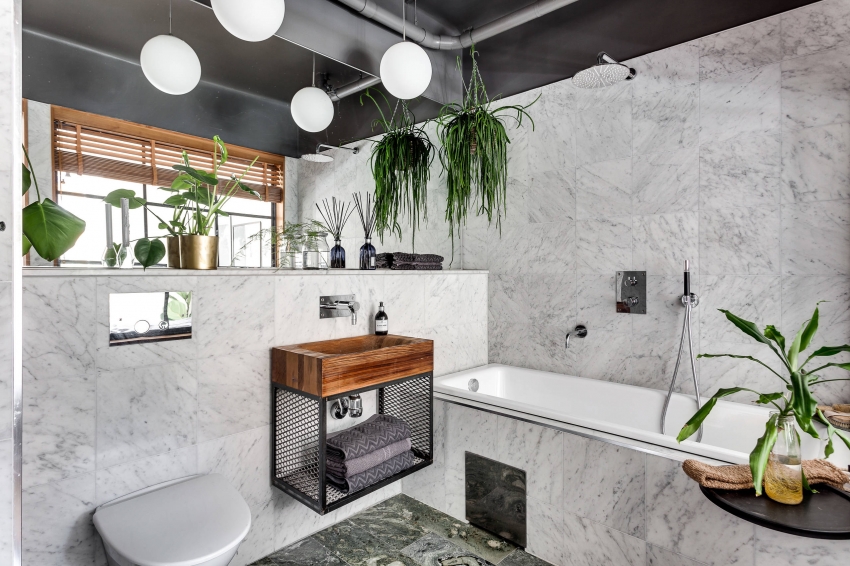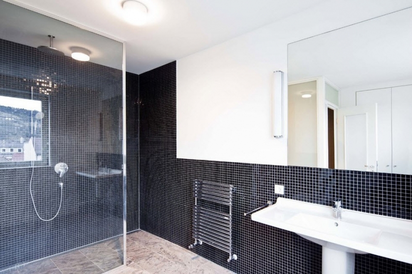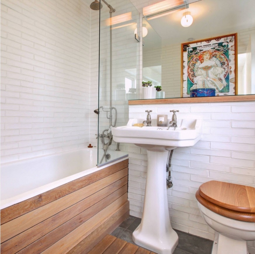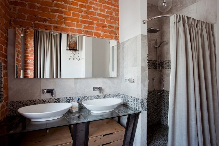 Gaya Loft sangat popular, di mana jubin yang meniru bata digunakan. Penyelesaian reka bentuk yang menarik untuk trend ini adalah pelapisan dinding bilik mandi dengan jubin babi putih yang digabungkan dengan lantai stoneware porselin gelap.