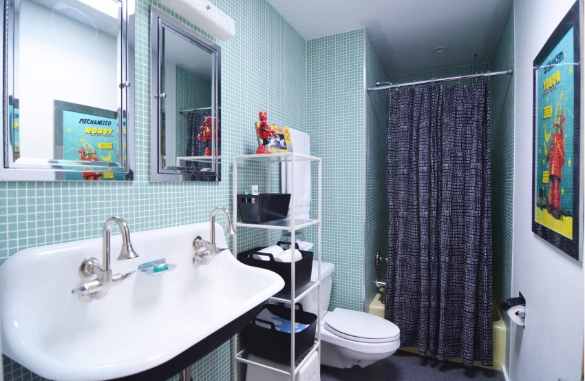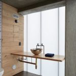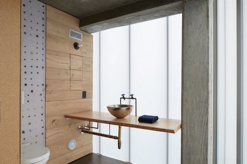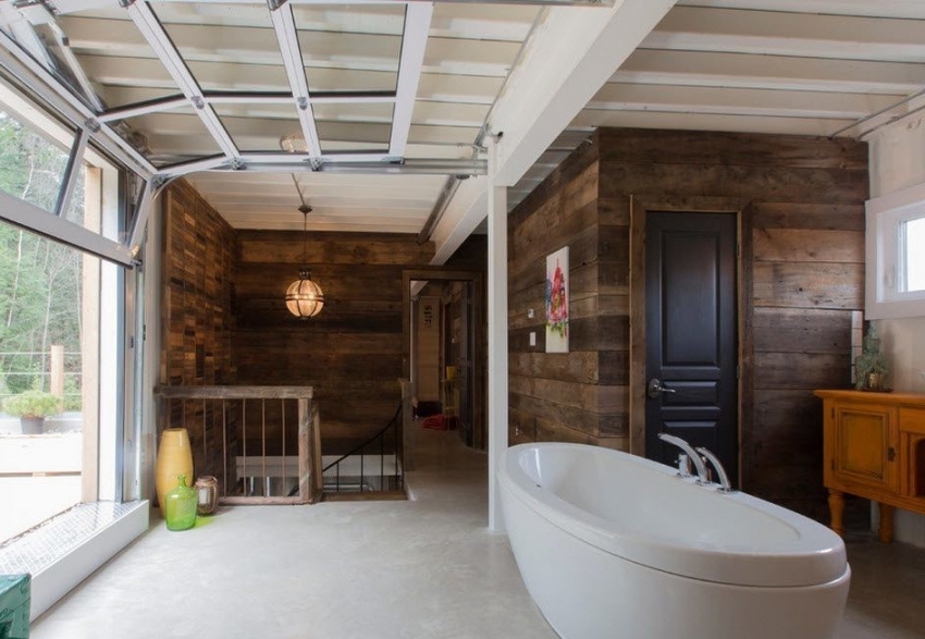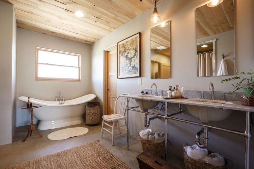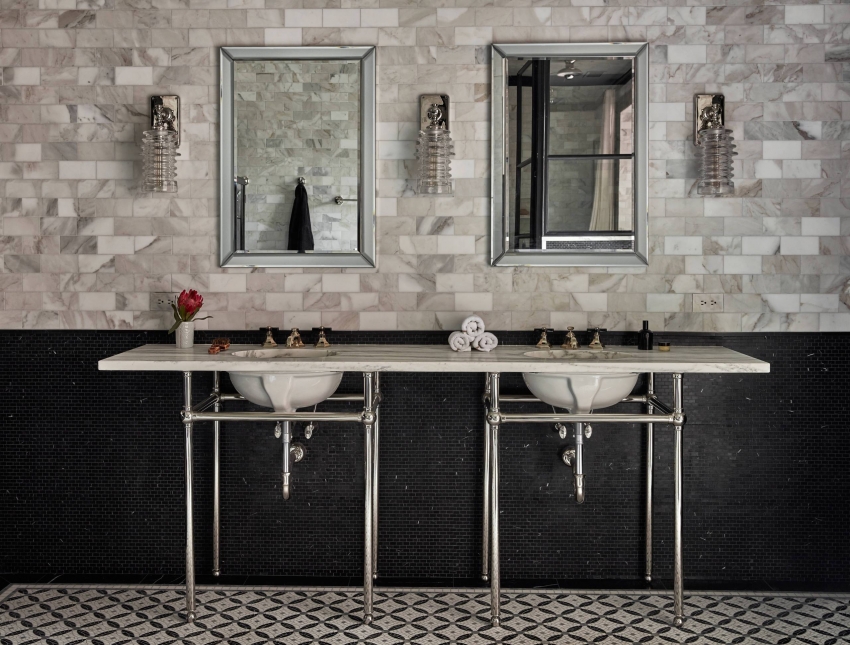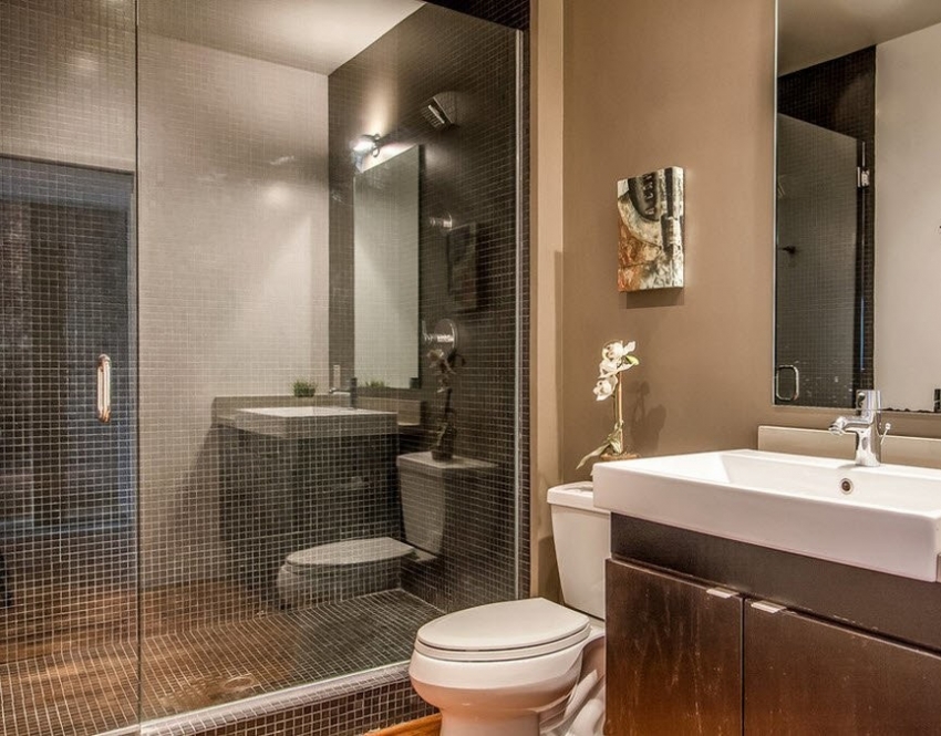 Gaya Loft sangat popular, di mana jubin yang meniru bata digunakan. Penyelesaian reka bentuk yang menarik untuk trend ini adalah pelapisan dinding bilik mandi dengan jubin babi putih yang digabungkan dengan lantai stoneware porselin gelap.