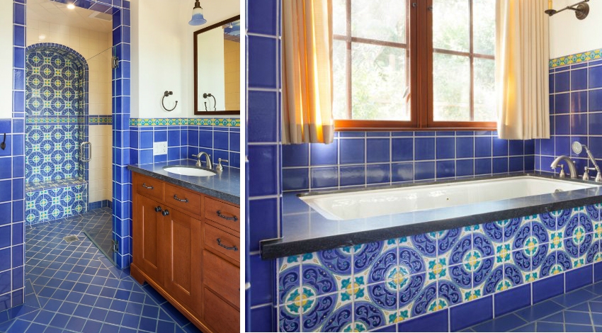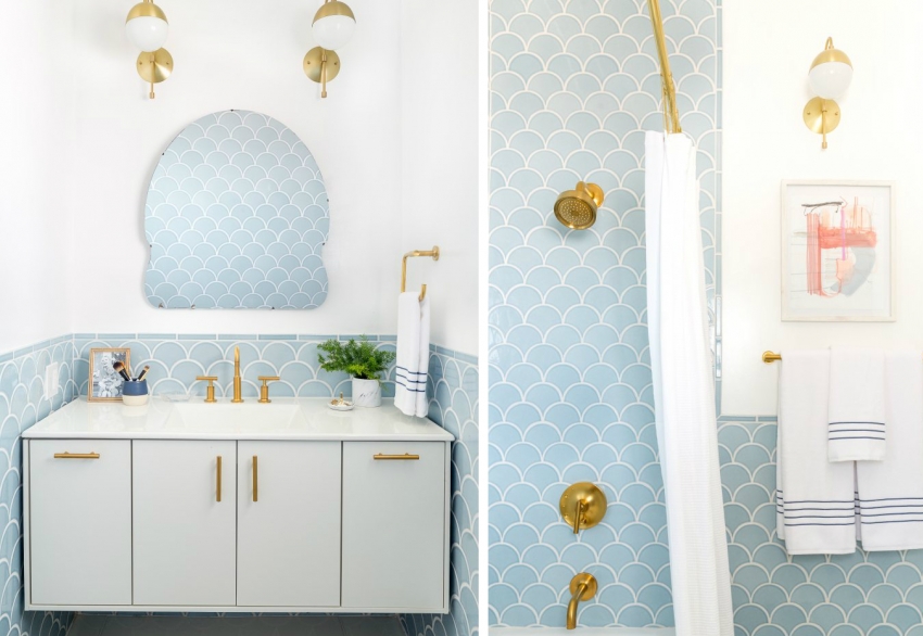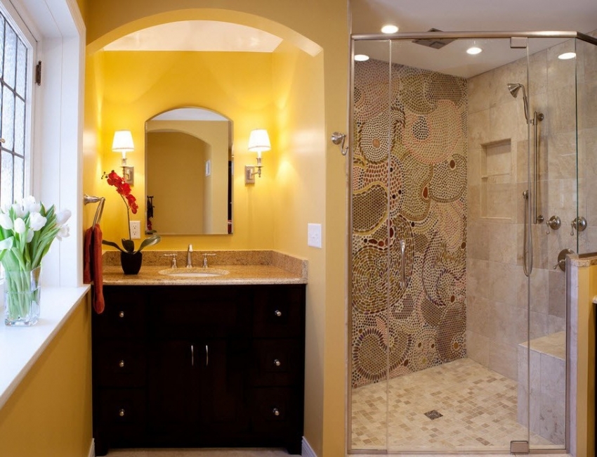 Anda boleh mewujudkan suasana yang hangat dan nyaman dengan menggunakan jubin yang indah di bilik mandi dengan warna yang menenangkan: kuning, hijau, biru, merah muda, persik, kuning air dan terakota. Warna mereka dapat digabungkan dengan selamat antara satu sama lain. Agar ruangan dapat memancarkan cahaya dan memberi emosi positif, ia dapat dihiasi dengan mutiara, krim, lavender, biru langit atau perak.