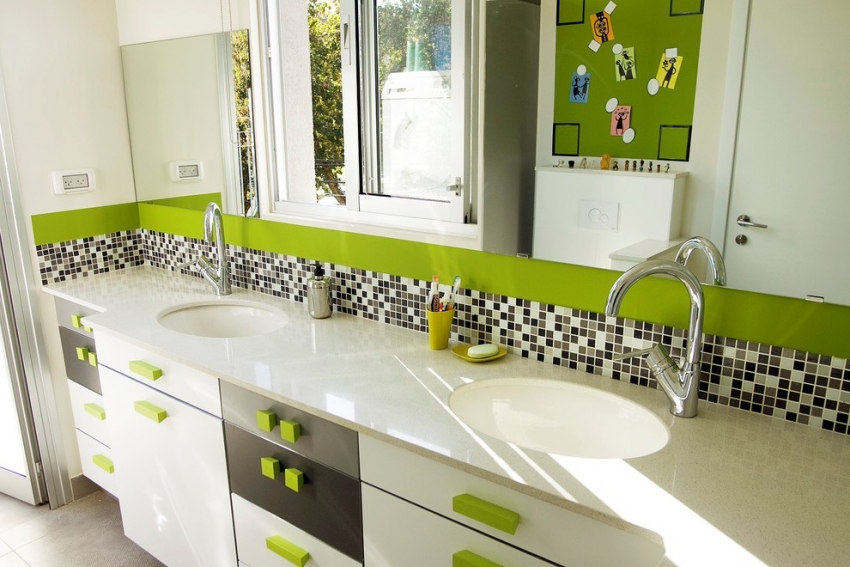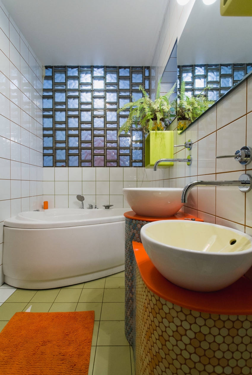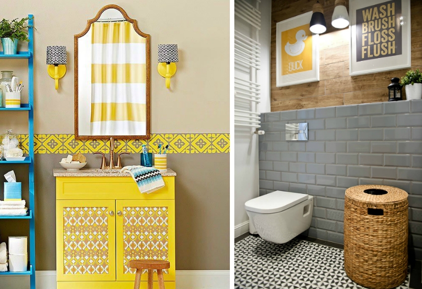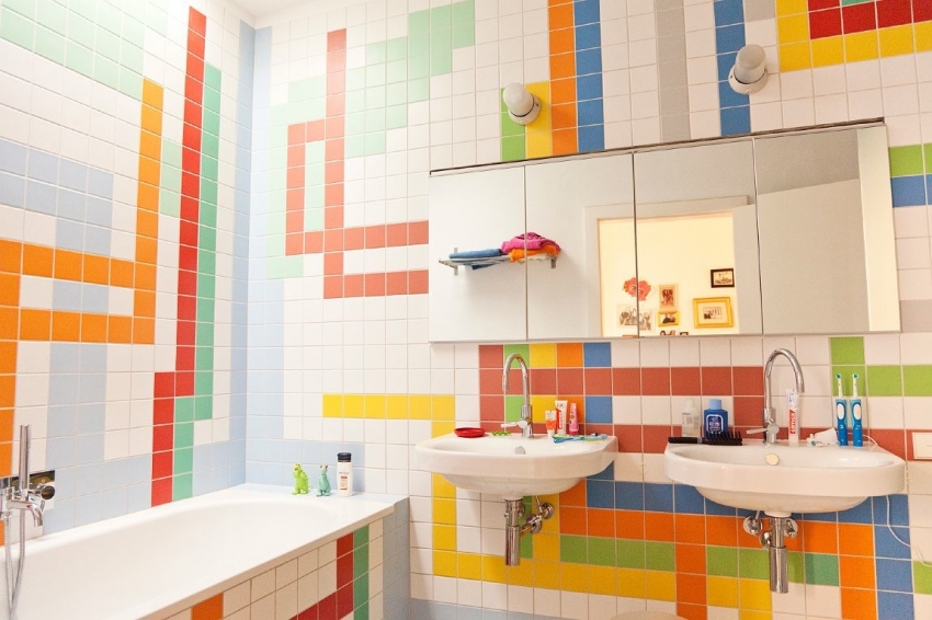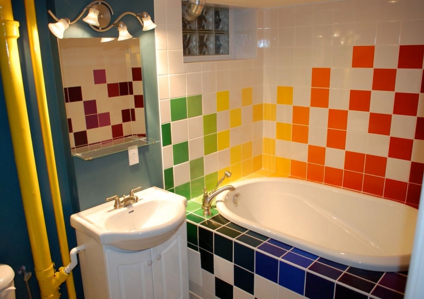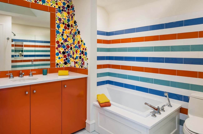 Aksen yang terang dan elemen hiasan akan menjadikan bahagian dalam bilik mandi berwarna-warni dan selesa