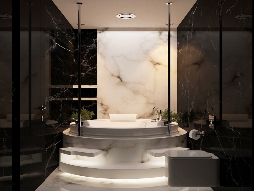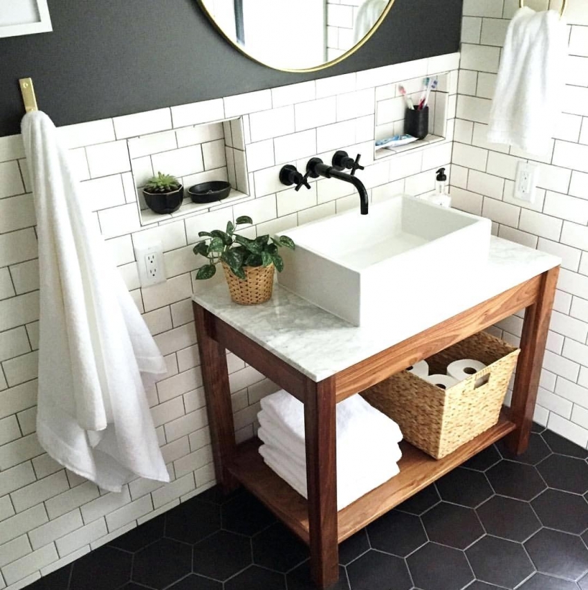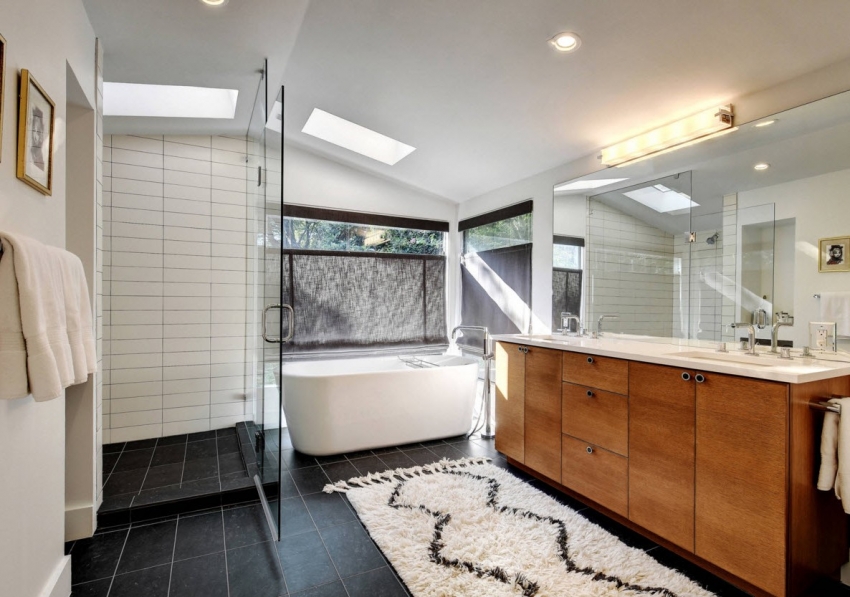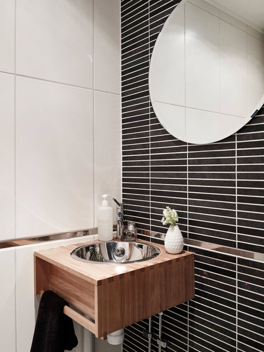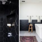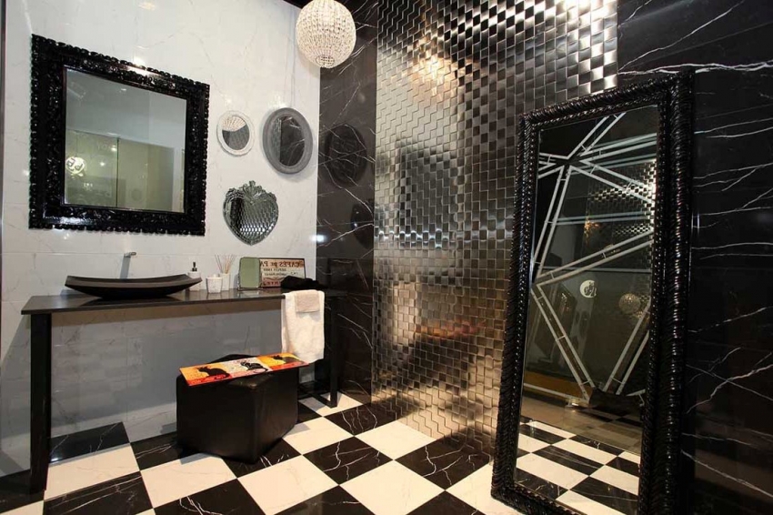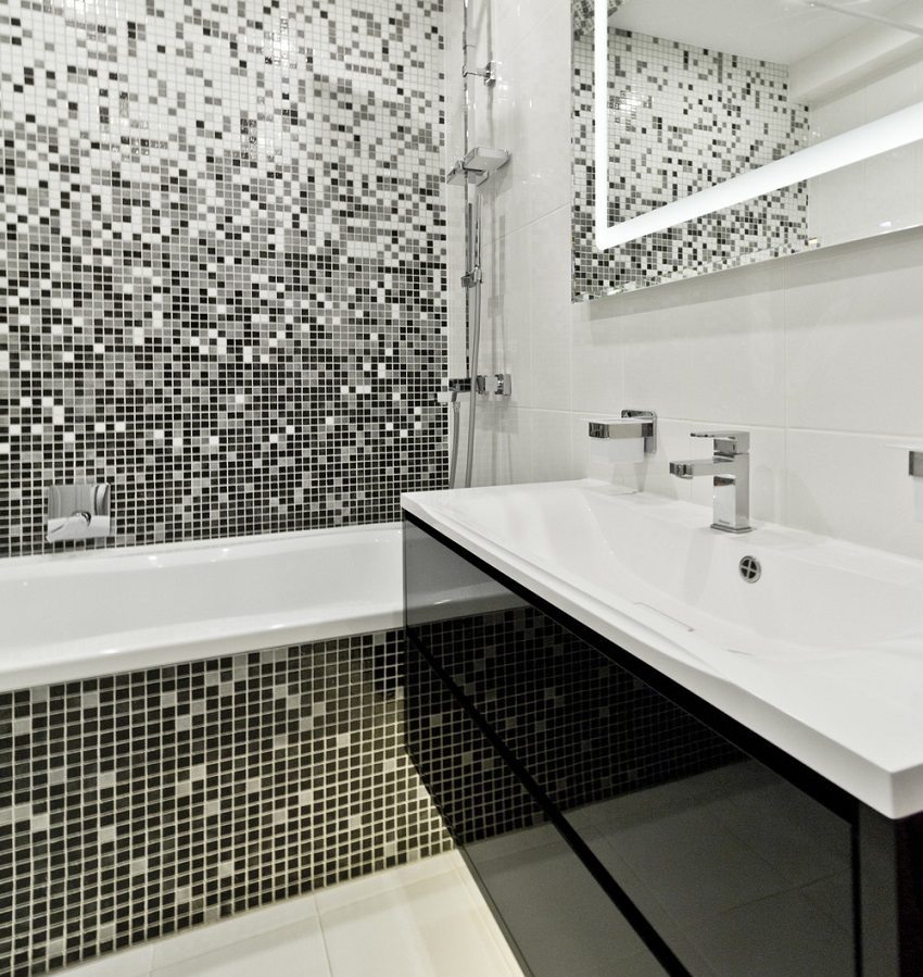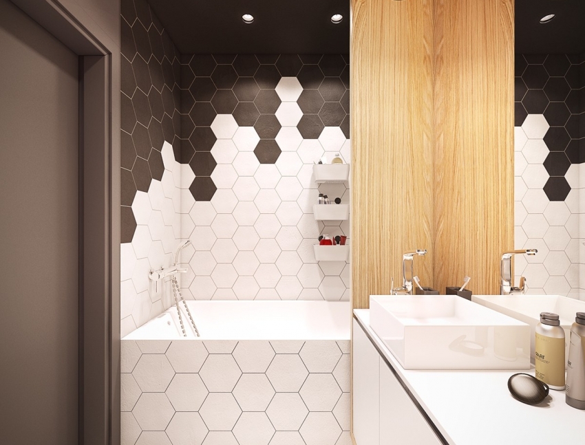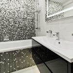 Jubin bilik mandi hitam dan putih mencerminkan kehendak gaya minimalis yang paling berjaya, yang, berkat kontras warna, mewujudkan reka bentuk bilik yang selesa dan pada masa yang sama terkawal.
