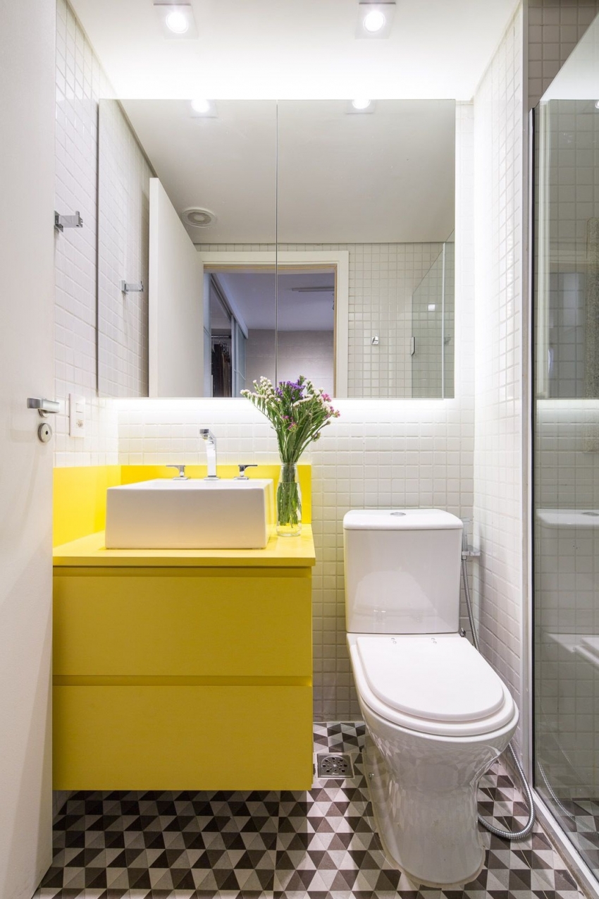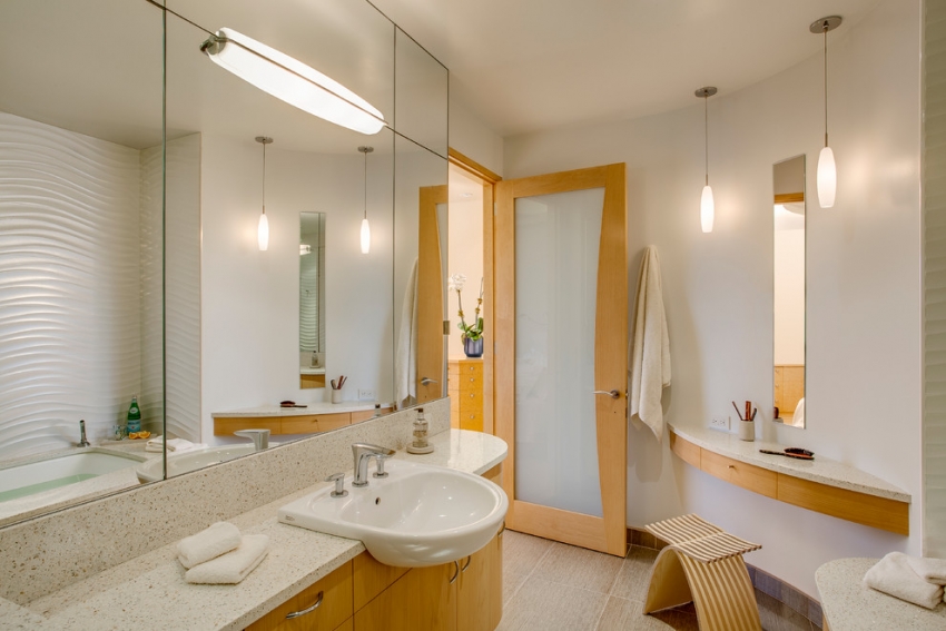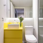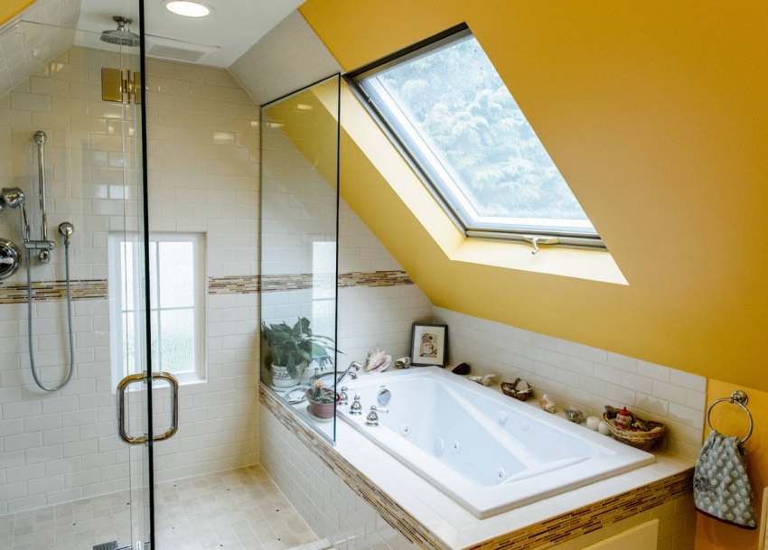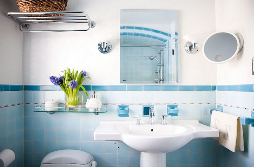 Pilihan yang ideal adalah penggunaan jubin berkilat putih, yang menjadikan bilik segar dan lapang. Namun, agar tidak mengubah bilik menjadi sejenis wad hospital, bahagian dalamnya boleh dicairkan dengan elemen hiasan yang terang. Ini mungkin tikar kaki, lampu, atau tuala.
