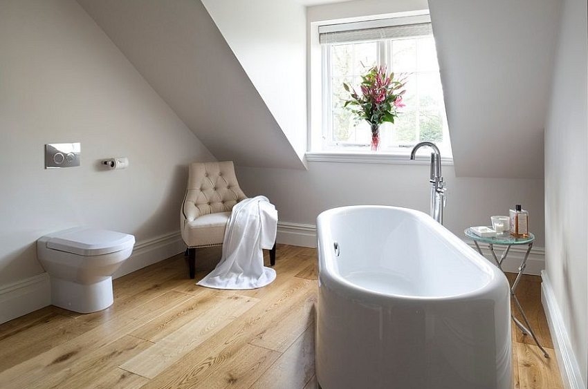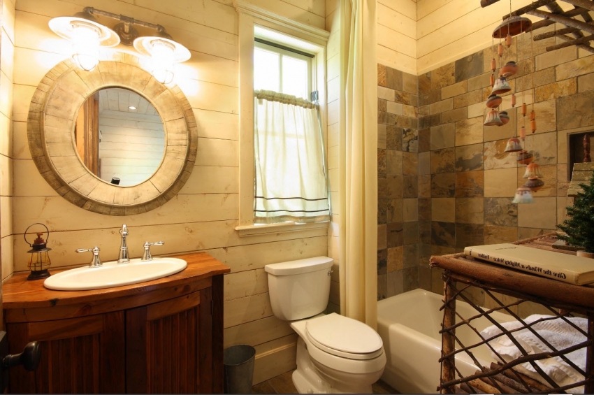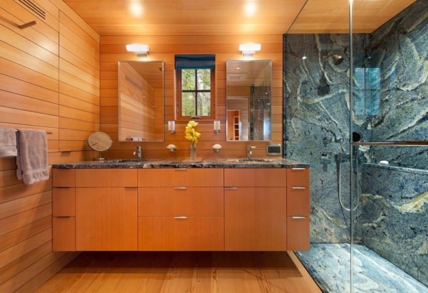Nasihat berguna! Dengan menggunakan jubin seperti kayu untuk bilik mandi, anda dapat membuat tiruan di sauna atau mandi yang diperbuat daripada kayu.