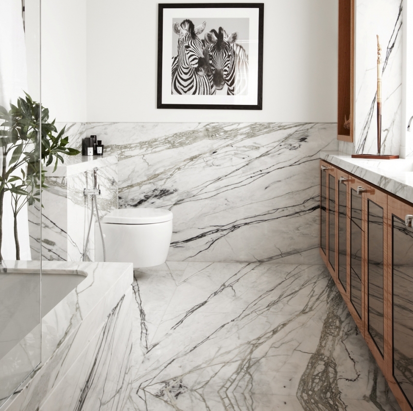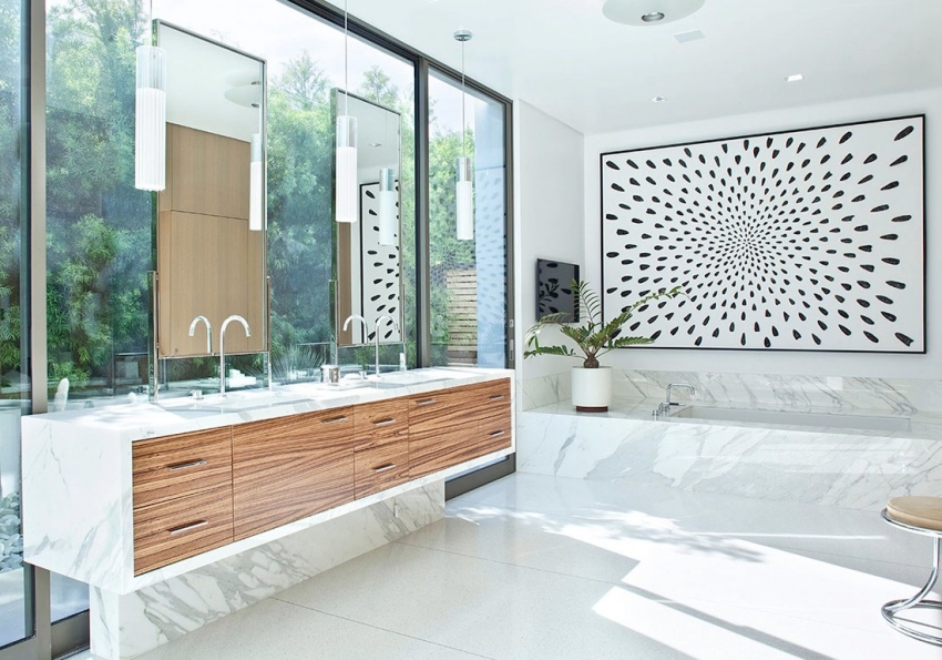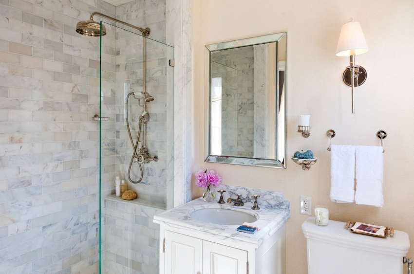 Jubin marmar putih sangat popular untuk bilik mandi kecil, yang bukan sahaja dapat membesarkan premis secara visual, tetapi juga memberikan sedikit sentuhan kecanggihan. Dengan jubin seperti itu, gambar bilik mandi adalah pengesahan yang jelas tentang ini, bilik akan kelihatan bergaya dan mahal.