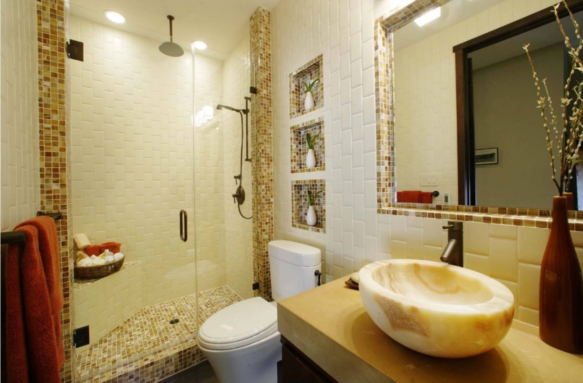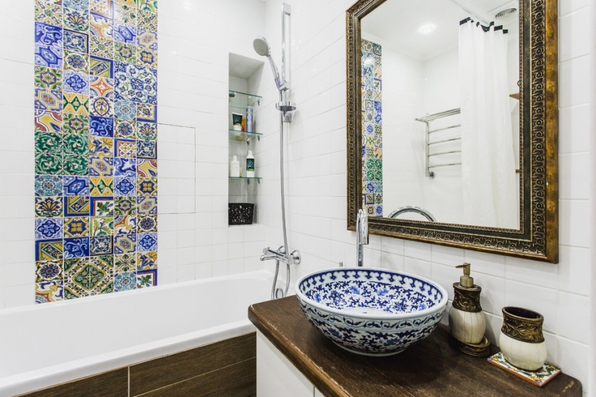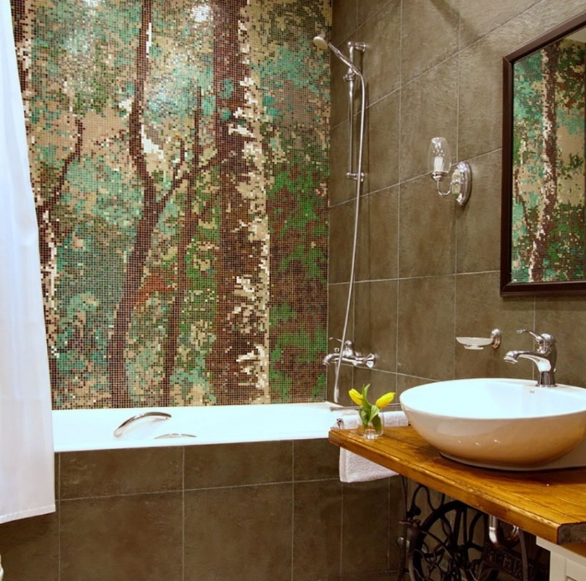 Nasihat berguna!Apabila keutamaan diberikan untuk menggunakan jubin dengan tiga warna atau lebih, lebih baik memilih mosaik, di mana warna jubin kecil yang berbeza-beza tidak dapat mengurangkan ruangan secara visual.