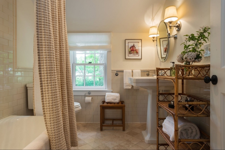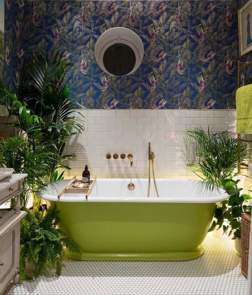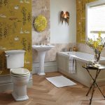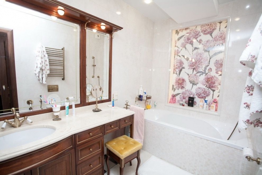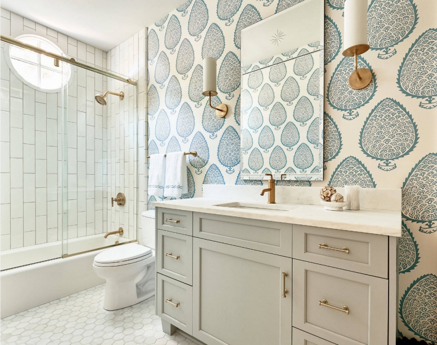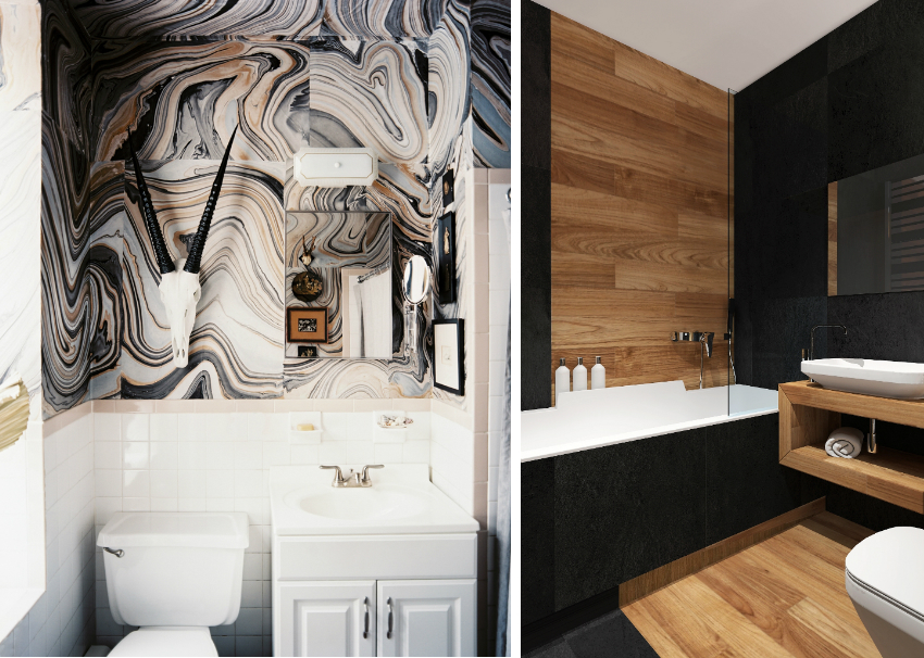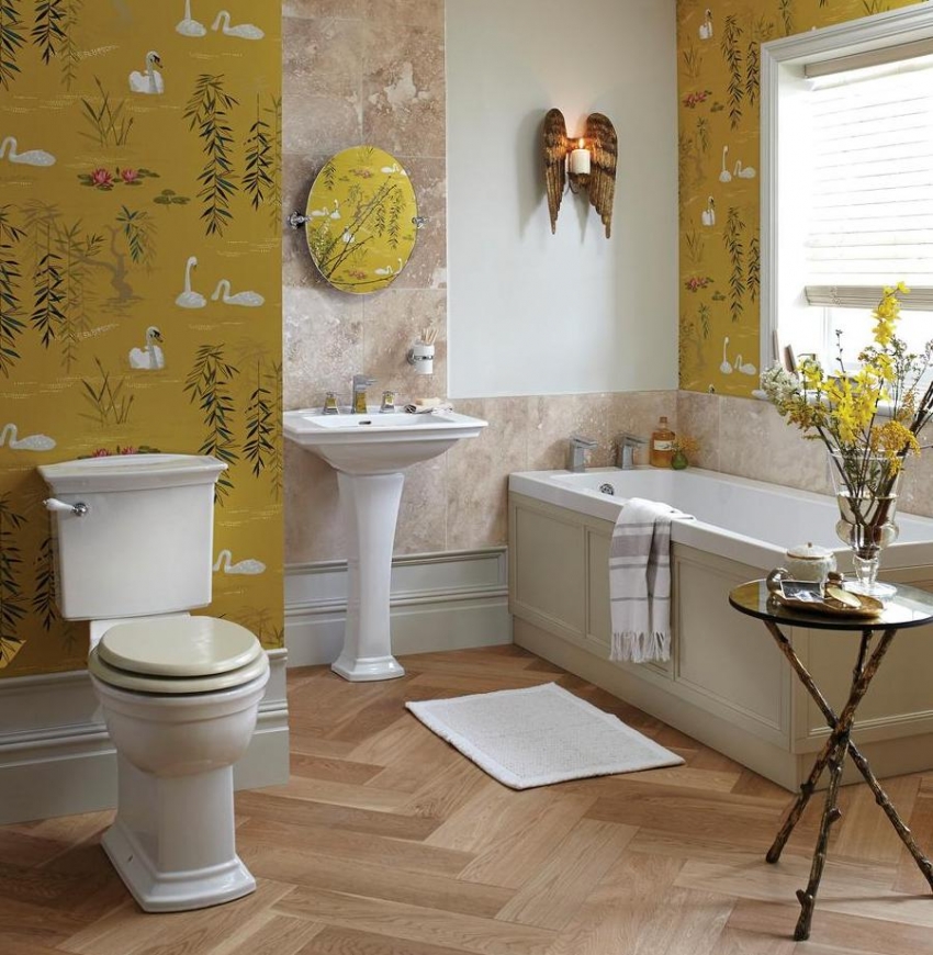 Untuk menghias bilik mandi klasik, anda boleh menggunakan kertas dinding tahan kelembapan