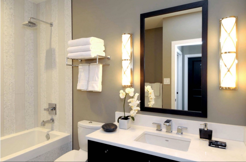 Anda boleh memperluas ruang bilik mandi secara visual dengan menggunakan jubin seramik berkilat untuk hiasan.