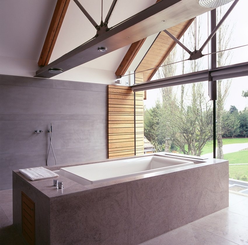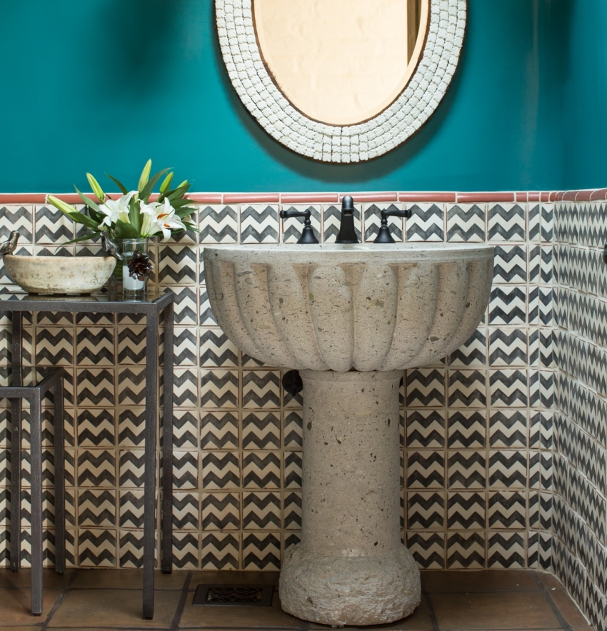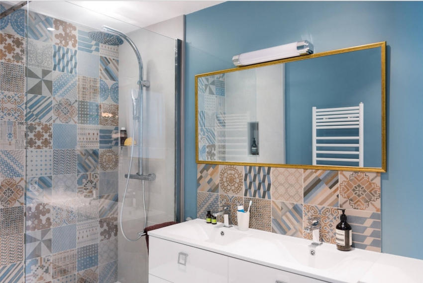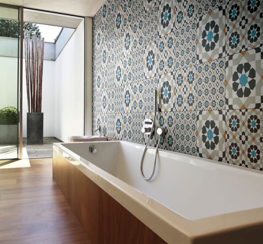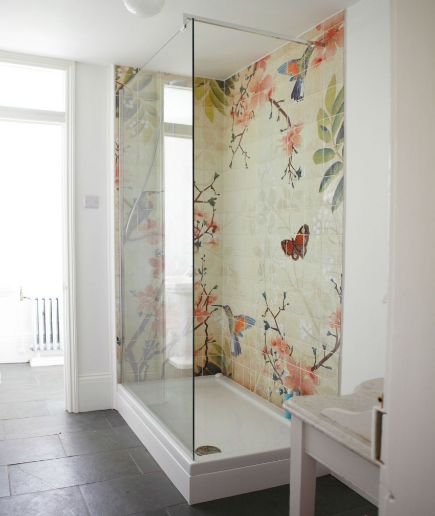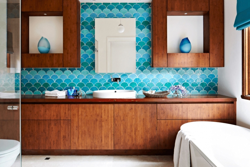 Dalam reka bentuk moden, teknik yang popular adalah menggabungkan jubin seramik dan lukisan dinding sederhana dengan cat kalis air.