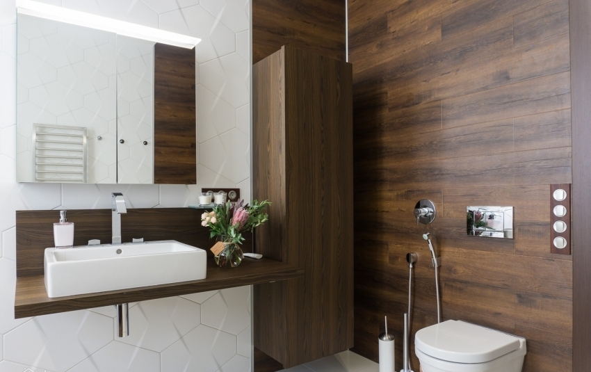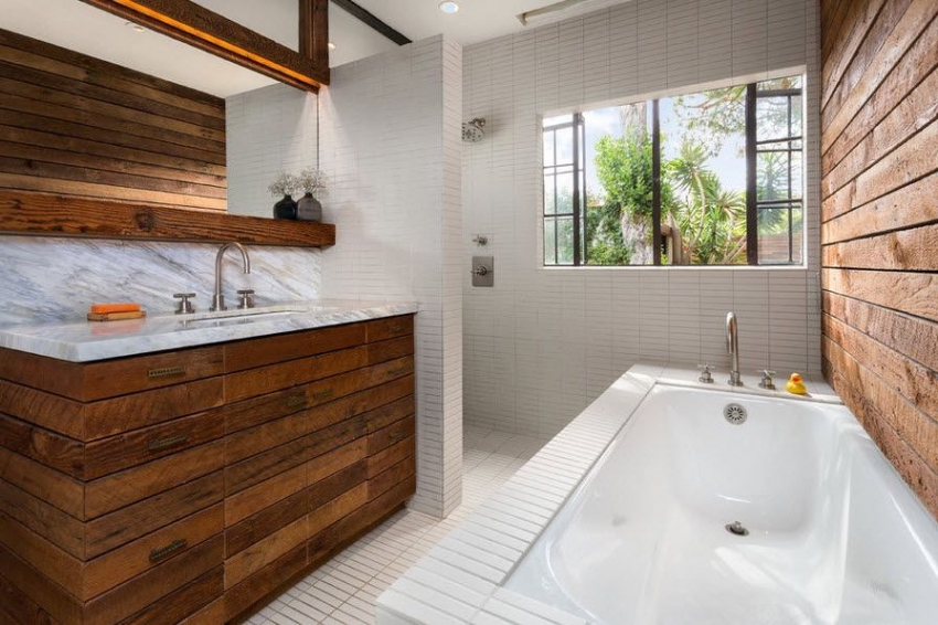 Pemegang bahan semula jadi dan mesra alam akan menyukai gabungan jubin dengan panel kayu, yang dirawat dengan pernis khas yang menghalang kelembapan masuk ke dalam rongga produk. Gabungan panel dengan jubin putih berkilat 20x30 cm, yang akan memberikan kesan kayu yang mulia, akan membantu mewujudkan suasana yang selesa dan hangat. Variasi lain yang perlu diberi perhatian adalah gabungan bahan dengan jubin porselin porselin. Bilik mandi seperti itu akan kelihatan bergaya, mahal dan rapi.