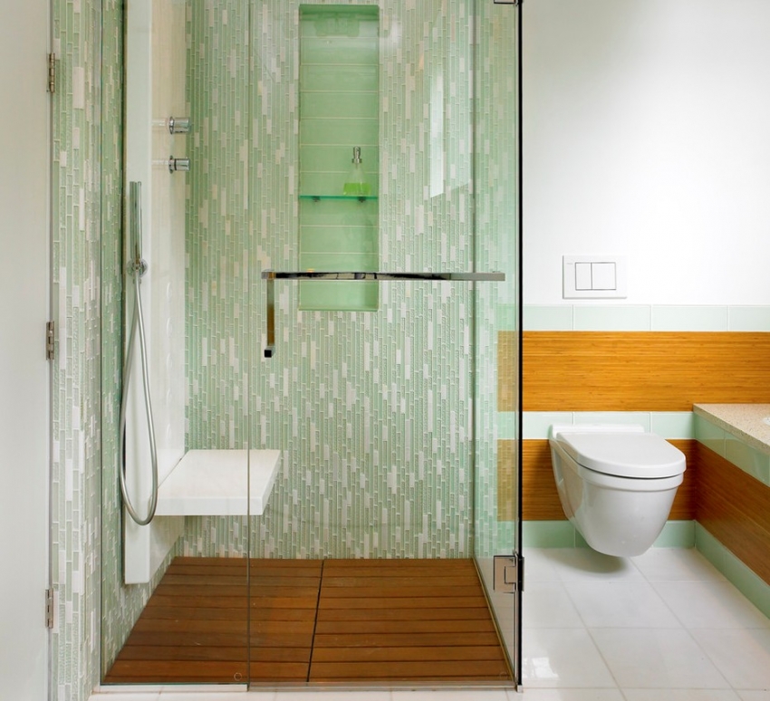 Salah satu jenis bahan yang paling menarik adalah jubin bilik mandi kaca. Foto reka bentuk dalaman bilik menggunakan bahan ini kelihatan besar dan lapang. Ini sangat sesuai untuk bilik mandi kecil. Walau bagaimanapun, ini adalah salah satu bahan yang paling mahal, yang juga mempunyai struktur rapuh.