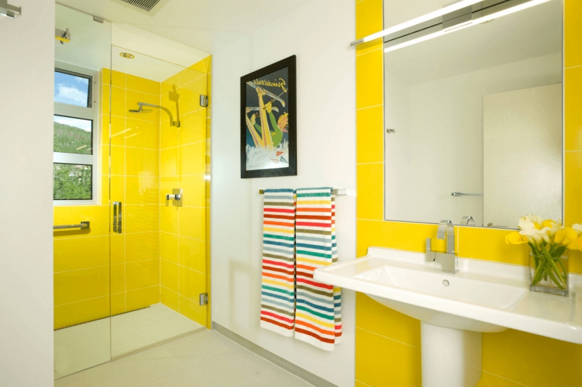 Nampak tidak biasa dan asli reka bentuk bilik mandi jubin di pangkalan ungu dengan percikan kuning. Dinding polos boleh dilengkapi dengan panel dengan warna atau jubin yang berlainan dengan corak dari bawah dan atas.