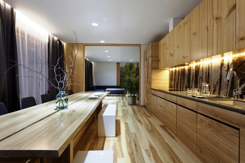 Perabot dapur harus mempunyai bentuk yang sederhana, dan jenis kayu yang berharga, seperti beech, oak, digunakan sebagai bahan. Ia cukup untuk menutup bahagian depan kabinet. Selain kayu, ia dibenarkan menggunakan plastik lutsinar, yang akan mewujudkan "tanpa berat" di ruang dan membantu mengimbangi bahagian dalam. Lebih baik menyembunyikan perkakas dapur sebanyak mungkin di belakang pintu kabinet.