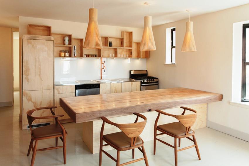 Ruang tamu yang digabungkan dengan dapur adalah penyelesaian yang sangat berpatutan dan bergaya untuk bilik yang dibuat dengan gaya eko