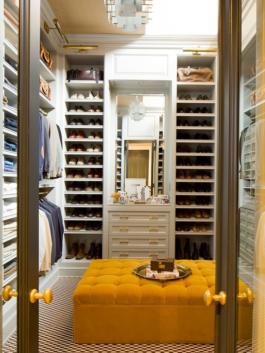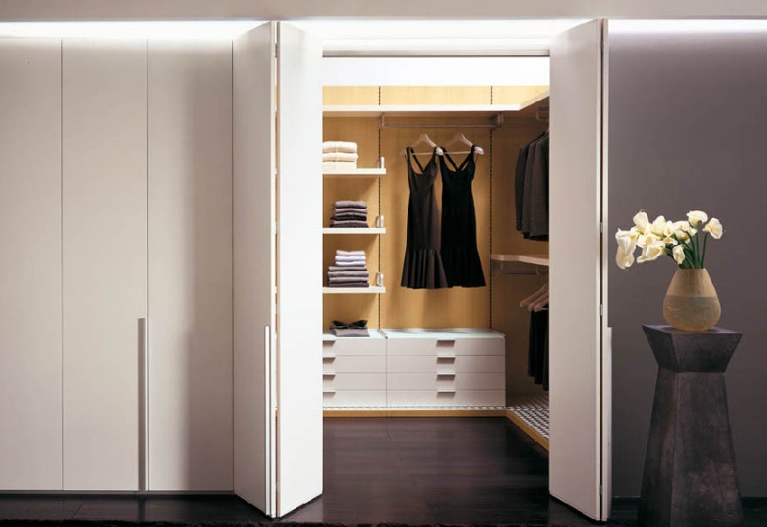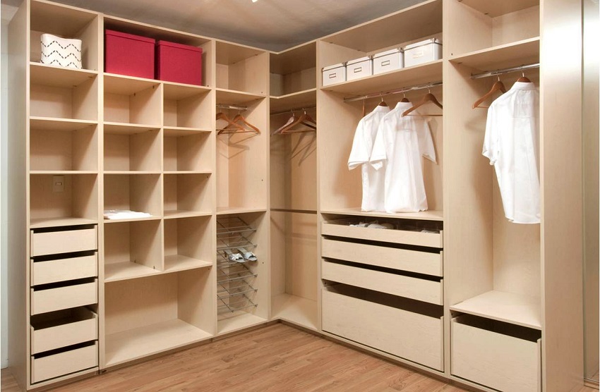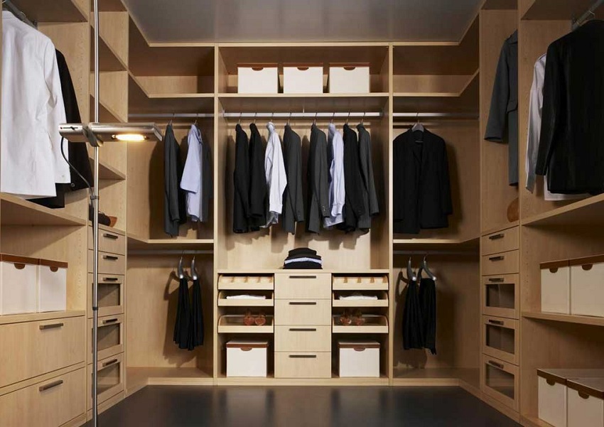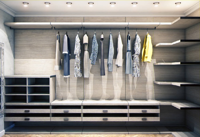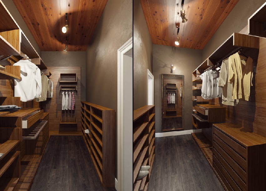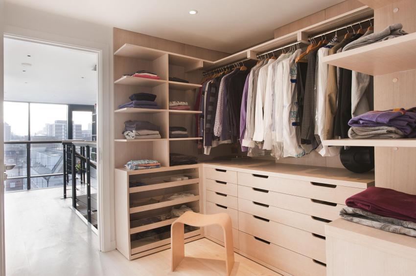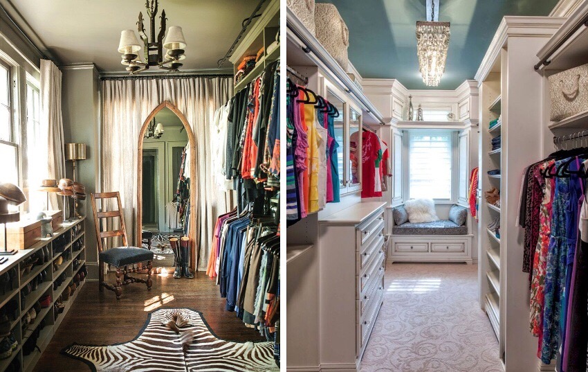 Bergantung pada lokasi di apartemen, konfigurasi dan area, ruang ganti dapat disusun di sepanjang satu dinding, dibentuk dengan sudut atau diberi bentuk berbentuk L atau U. Teknologi terkini memungkinkan untuk merancang sistem penyimpanan yang optimum untuk bilik persalinan apa pun, walaupun sederhana. Bagaimanapun, kelebihan utama pengisian dalaman adalah sebilangan besar komponen untuk setiap selera.