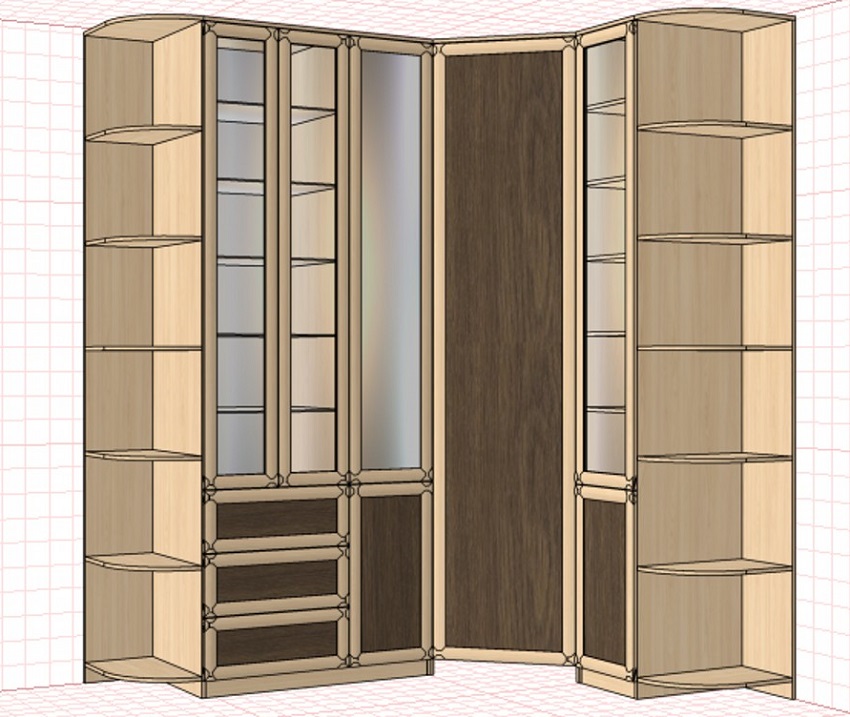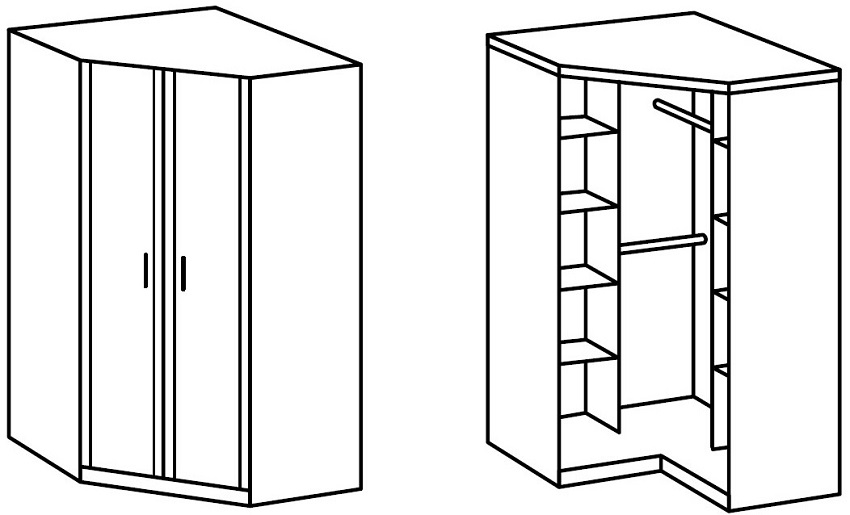 Almari sudut di lorong boleh dipagari menggunakan pintu ayunan, pintu akordeon atau partisi gelongsor ringan, namun, perlu dipertimbangkan ciri lorong. Sekiranya bilik agak sederhana, pilihan swing sama sekali tidak sesuai. Sistem gelongsor radial kelihatan spektakuler, pengisiannya dipadankan secara serentak dengan bahagian dalaman umum.