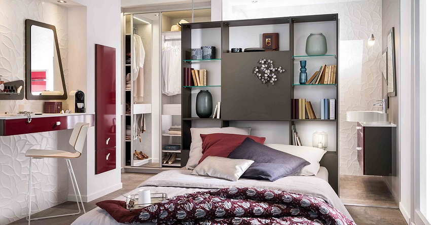 Nasihat berguna! Idea yang menarik untuk mengatur bilik persalinan di bilik tidur di belakang kepala tempat tidur: ia dipisahkan oleh partition pegun ringan atau sistem gelongsor.