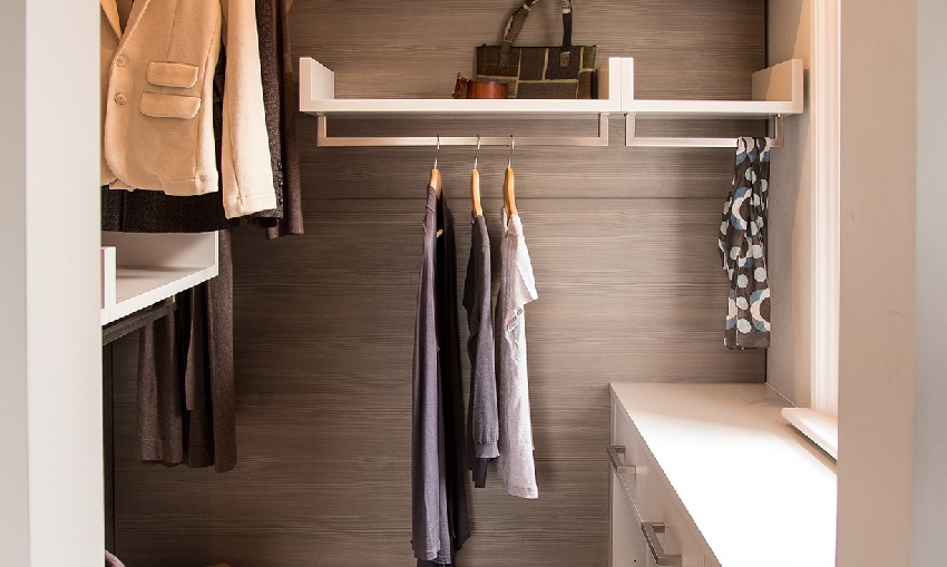 Sekiranya anda memilih bilik persalinan sudut di lorong, yang akan dipisahkan dari bilik utama, maka anda boleh mengatur bahagian dalaman dengan dua cara: di sepanjang satu atau dua dinding. Skema pilihan pertama adalah sistem penyimpanan yang dipasang padat di sepanjang satu dinding. Dianjurkan untuk membiarkan rak dan rak terbuka untuk menjimatkan ruang. Ruang yang tinggal digunakan untuk bergerak di sekitar bilik persalinan, dan juga di bawah ruang ganti.