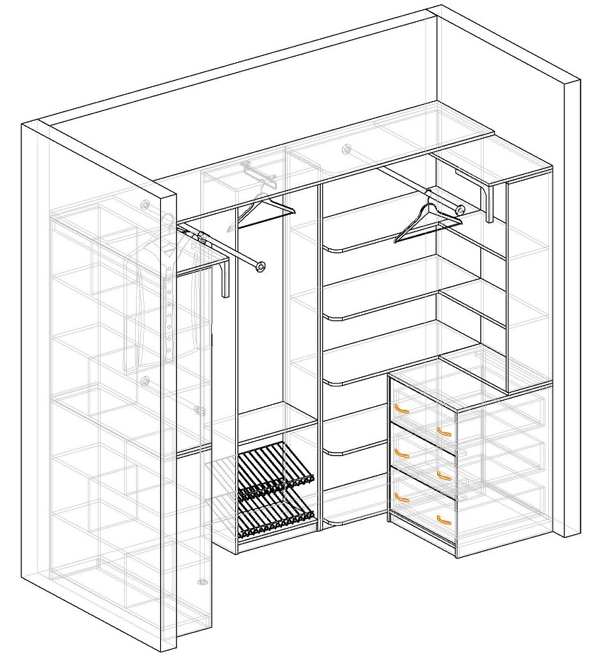 Sebaik sahaja hiasan dinding selesai, mereka mula membuat dan memasang sistem penyimpanan dalaman. Pembelian bahan dilakukan mengikut gambar dan lakaran yang dikembangkan. Mereka mengira jumlah papan serpihan, paip perabot, kelengkapan, pengikat, skru yang diperlukan, dan juga elemen tambahan sistem penyimpanan.