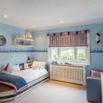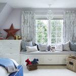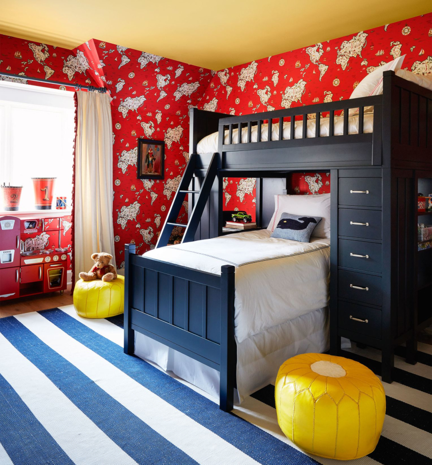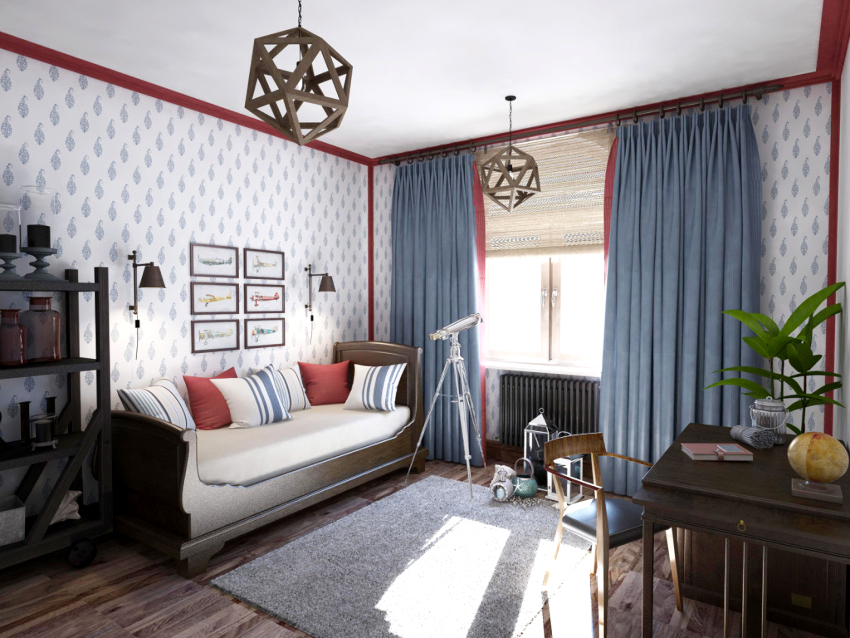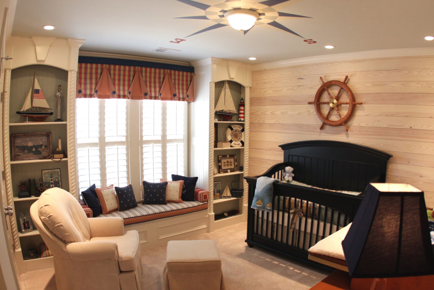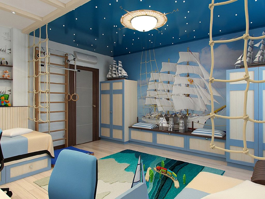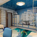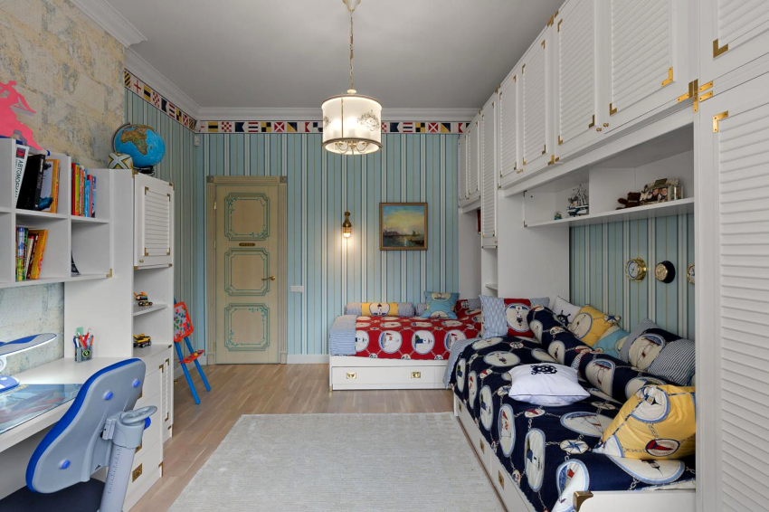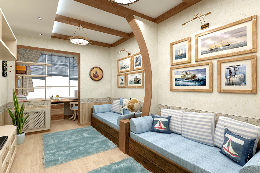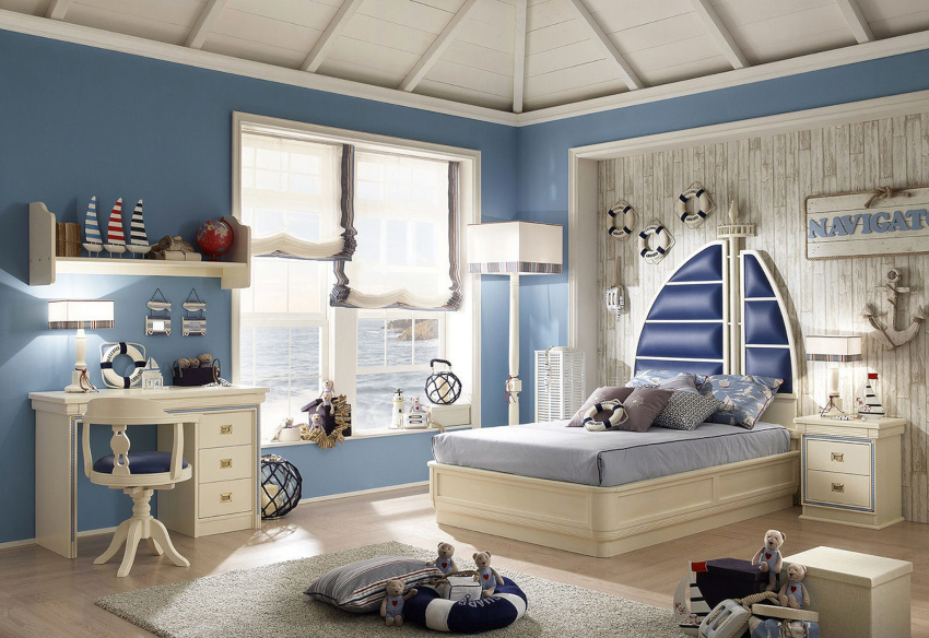 Nautikal. Sesuai untuk menghias bilik kanak-kanak prasekolah dan usia sekolah. Gaya mengandaikan kehadiran permukaan bergaris menggunakan warna putih, sian dan biru. Dinding aksen dengan peta dunia yang besar akan kelihatan baik. Pirate Chest boleh digunakan untuk menyimpan mainan.