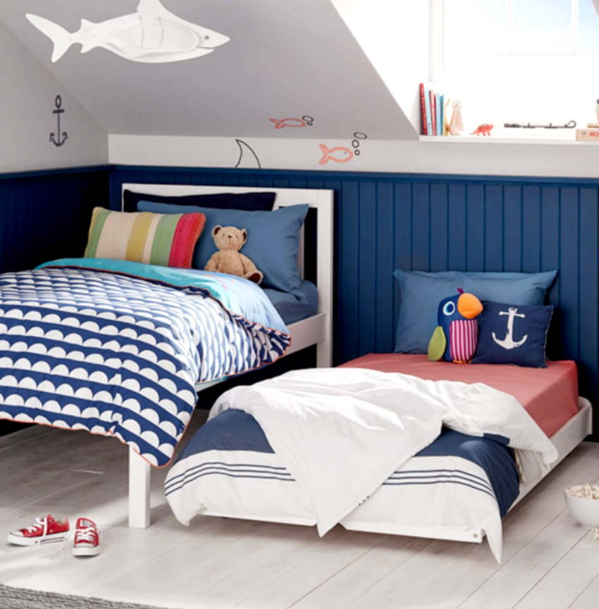 Sekiranya kita bercakap mengenai mengatur bilik kanak-kanak untuk dua anak lelaki, setiap orang perlu memperuntukkan sudut mereka sendiri, menggunakan teknik pengezonan ruang. Adalah penting bahawa setiap kanak-kanak mempunyai tempat untuk bekerja dan menyimpan pakaian.