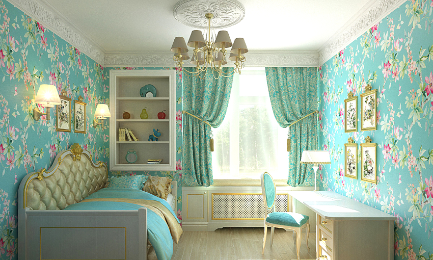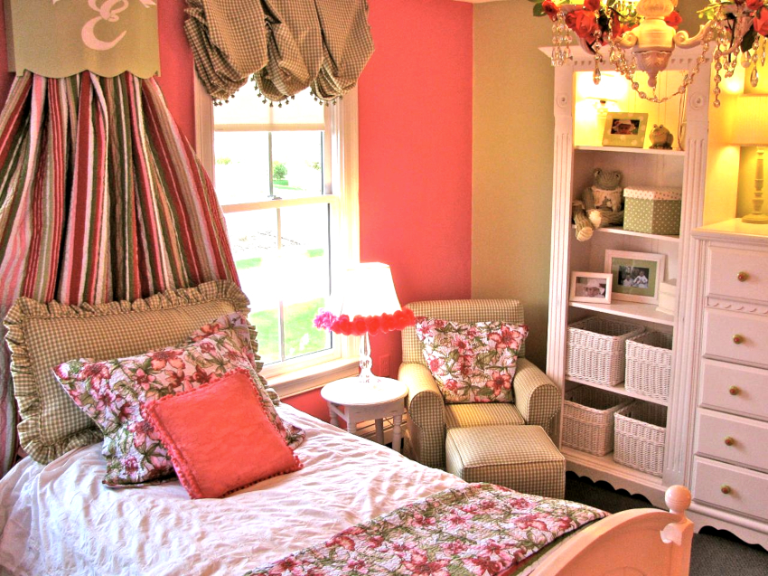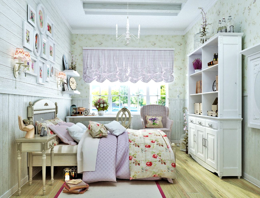 Provence. Pilihan yang bagus untuk mewujudkan bilik yang cantik untuk seorang gadis. Penggunaan sebilangan besar ruffles, ruffles dan cetakan bunga adalah tipikal.