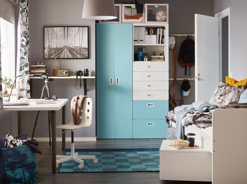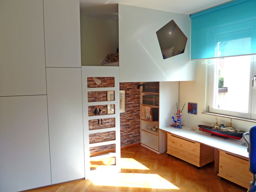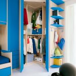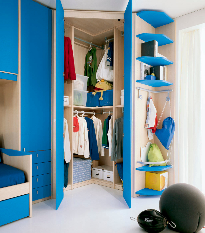 Semakin tua anak, semakin banyak ruang yang diperlukan untuk menyimpan barang, kasut dan barang-barang kecil yang lain. Untuk tujuan ini, almari gelangsar, rak, rak terbuka dan tarik digunakan. Semakin banyak tempat untuk menyimpan barang-barang kecil, semakin mudah mengatur pesanan di dalam bilik.