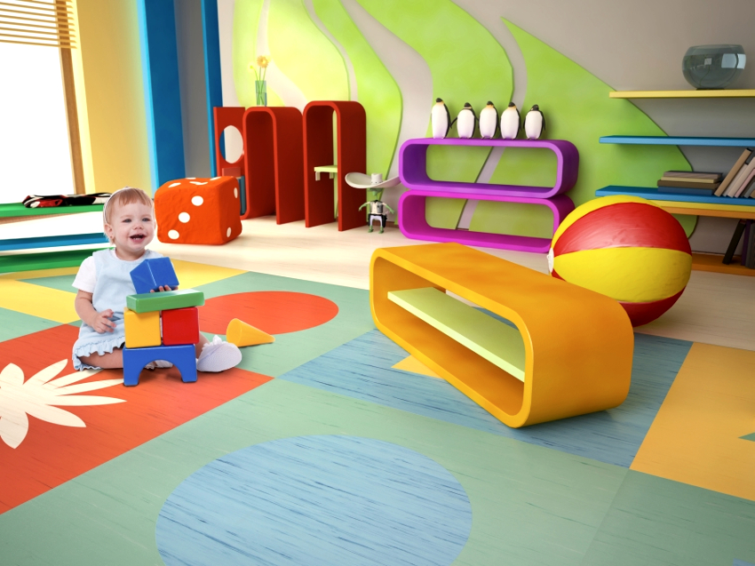 Oleh kerana kanak-kanak menghabiskan sebahagian besar masa di lantai bermain permainan, penamat permukaan ini mesti didekati dengan teliti. Penting agar lantai stabil, sebaiknya diperbuat daripada bahan semula jadi, mudah dibersihkan, tidak licin dan tahan kelembapan. Lebih kerap digunakan untuk kemasan lantai: