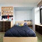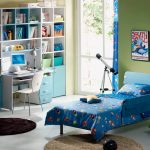 Remaja lelaki minimalis, jadi dalam foto bahagian dalam bilik kanak-kanak anda sering dapat melihat jumlah perabot minimum, kehadiran hanya yang paling diperlukan. Agar tidak berantakan di ruangan, disarankan untuk menggunakan struktur modular dan lipat.