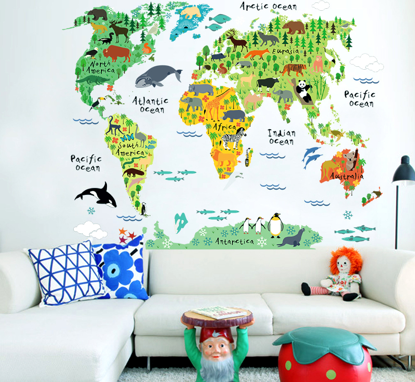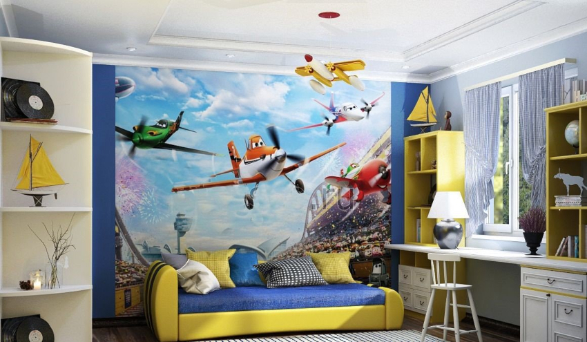 Di dinding di taman asuhan kanak-kanak, kertas dinding 3D akan kelihatan baik, tetapi lebih baik anak memilih gambarnya sendiri. Warna utama untuk menghias bilik budak lelaki adalah hijau, kuning, coklat dan biru.