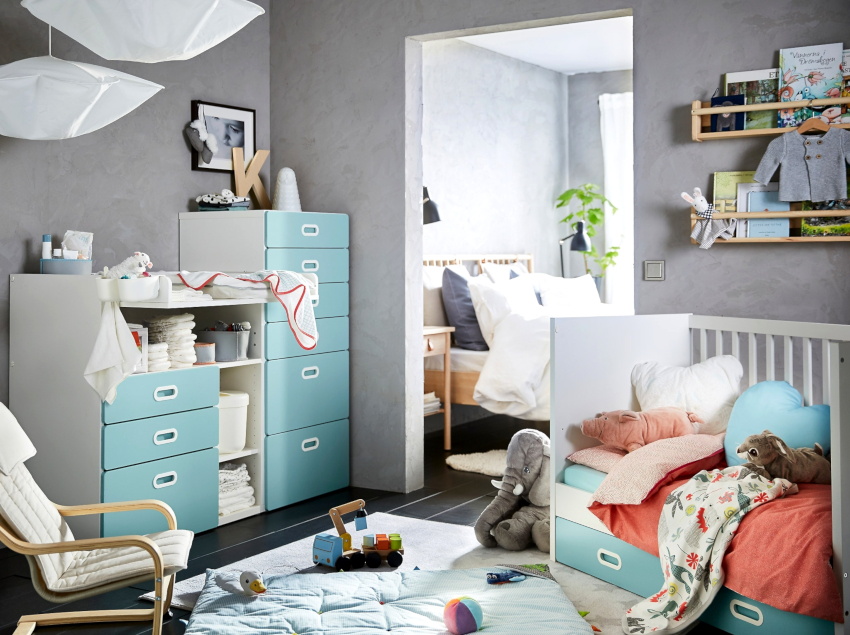 Untuk kanak-kanak di bawah satu tahun, bilik harus mempunyai set perabot minimum: buaian, meja ganti, almari pakaian. Lebih baik apabila semua perkara untuk kanak-kanak itu terletak di dekat meja ganti, di mana anak akan kerap. Pilihan terbaik adalah pilihan tempat tidur yang boleh ditukar, yang boleh digunakan oleh kanak-kanak sehingga 7 tahun atau lebih lama.