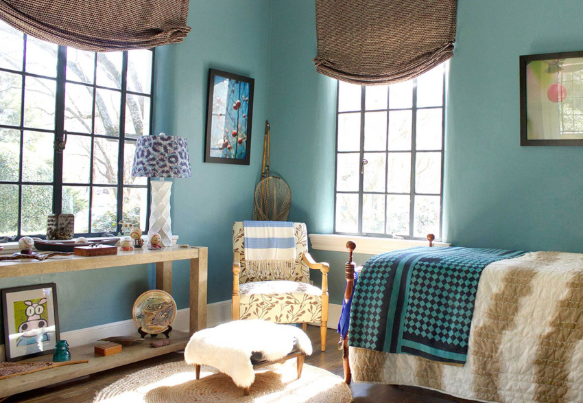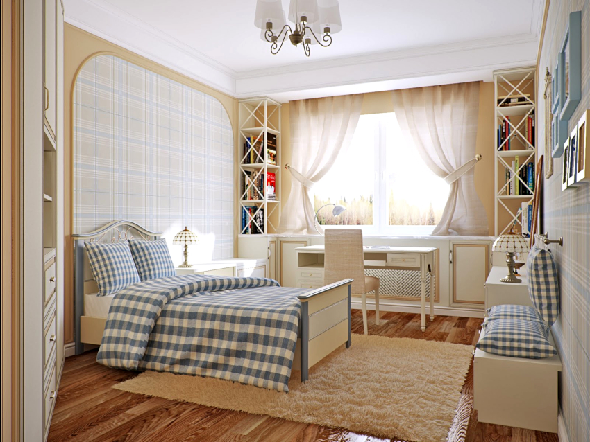 Orang Scandinavia.Arahnya lebih suka penggunaan warna sejuk, oleh itu lebih sesuai untuk menghias bilik dengan cahaya semula jadi yang mencukupi. Papan parket putih kelihatan cantik di lantai, lebih baik menutup tingkap dengan tirai roller biru. Ia melengkapkan bahagian dalam dengan tekstil terang dan permaidani kecil di tepi katil.
