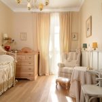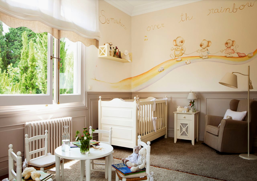 Klasik. Reka bentuk yang sesuai untuk bilik kanak-kanak perempuan dan budak lelaki. Kehadiran warna pastel adalah ciri: krim, kuning air, seperti kayu. Bilik itu mesti mengandungi perabot kayu dan tekstil khas.