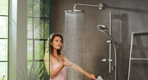 Tiang mandi dengan pancuran hujan dan pengadun: kelonggaran rumah yang lengkap