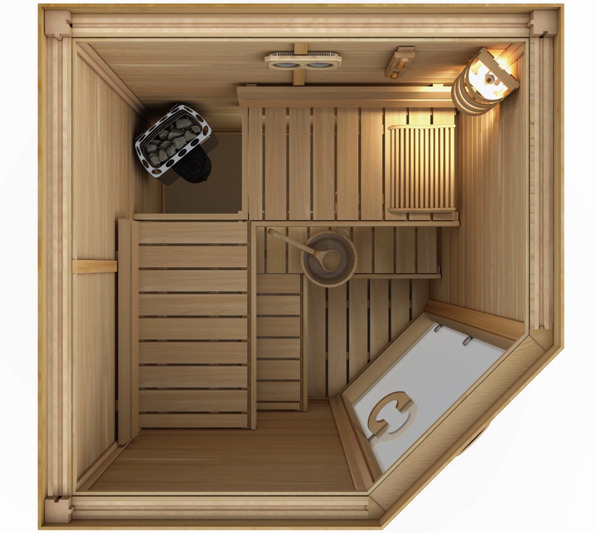 Reka bentuk kabin sauna, tanpa mengira saiznya, mestilah kedap udara. Di bilik-bilik kecil, model bersaiz padat dipasang. Sekiranya kawasan bilik cukup besar, anda boleh melengkapkan bilik dua atau tiga tempat duduk.