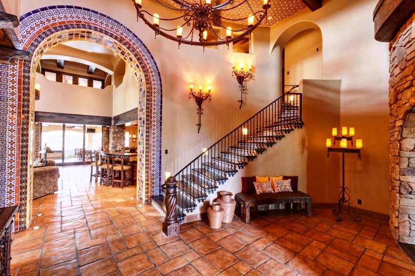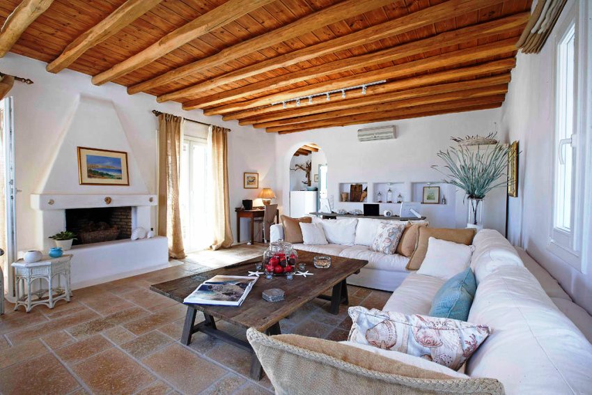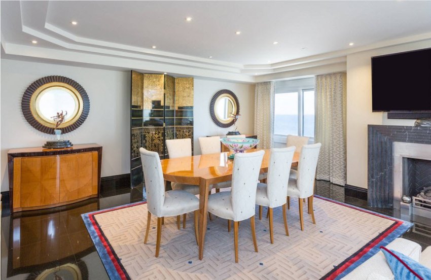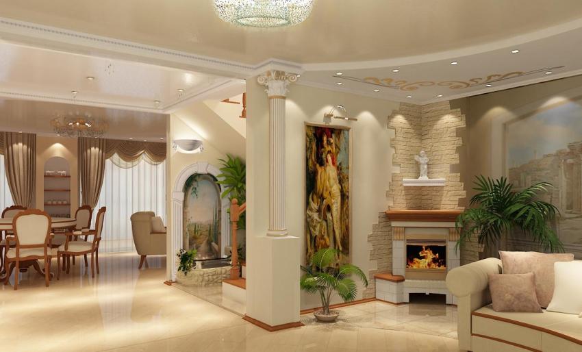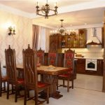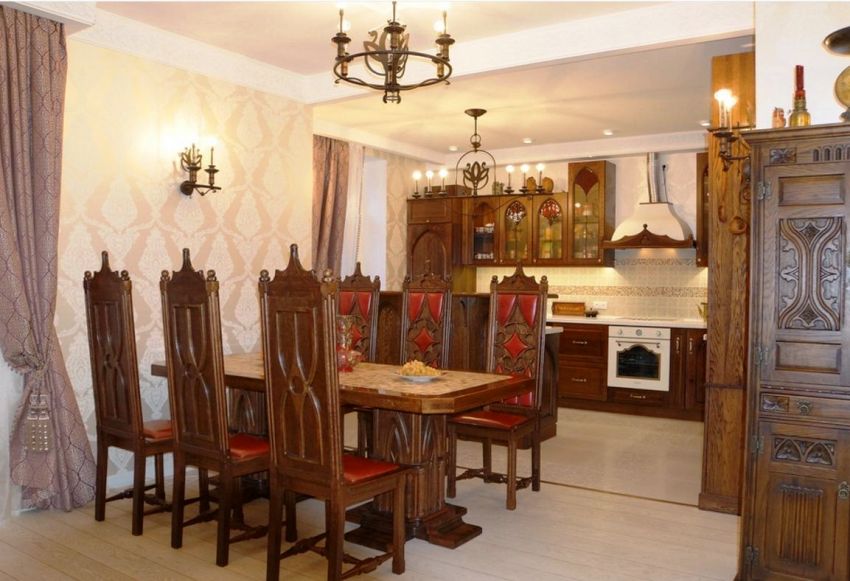 Bahagian dalam rumah atau apartmen, dibuat dengan gaya yang sama, mempunyai ciri khas berikut:
