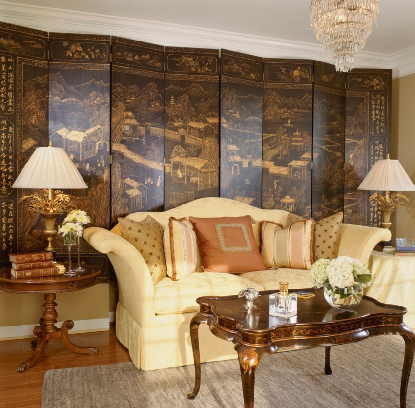 Perabot mempunyai bentuk yang kompleks; di antara hiasannya terdapat unsur penempaan, benda yang terbuat dari kayu gelap, sutera dan porselin. Tumbuhan hidup dan jimat feng shui dialu-alukan. Untuk warna, kehadiran kontras adalah wajib di sini, kombinasi warna putih dengan hitam atau merah, warna hijau murni, biru atau kuning juga sesuai. Garis-garis geometri dan bunga yang halus harus ada pada gambar. Gaya Cina adalah: